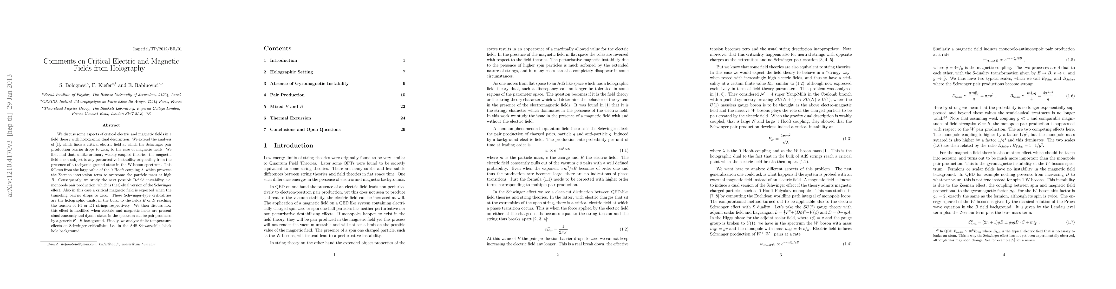 We discuss some aspects of critical electric and magnetic fields in a field theory with holographic dual description. We extend the analysis of arxiv:1109.2920, which finds a critical electric field at which the Schwinger pair production barrier drops to zero, to the case of magnetic fields. We first find that, unlike ordinary weakly coupled theories, the magnetic field is not subject to any perturbative instability originating from the presence of a tachyonic ground state in the W-boson spectrum. This follows from the large value of the 't Hooft coupling \lambda, which prevents the Zeeman interaction term to overcome the particle mass at high B. Consequently, we study the next possible B-field instability, i.e. monopole pair production, which is the S-dual version of the Schwinger effect. Also in this case a critical magnetic field is expected when the tunneling barrier drops to zero. These Schwinger-type criticalities are the holographic duals, in the bulk, to the fields E or B reaching the tension of F1 or D1 strings respectively. We then discuss how this effect is modified when electric and magnetic fields are present simultaneously and dyonic states in the spectrum can be pair produced by a generic E - B background. Finally, we analyze finite temperature effects on Schwinger criticalities, i.e. in the AdS-Schwarzshild black hole background.