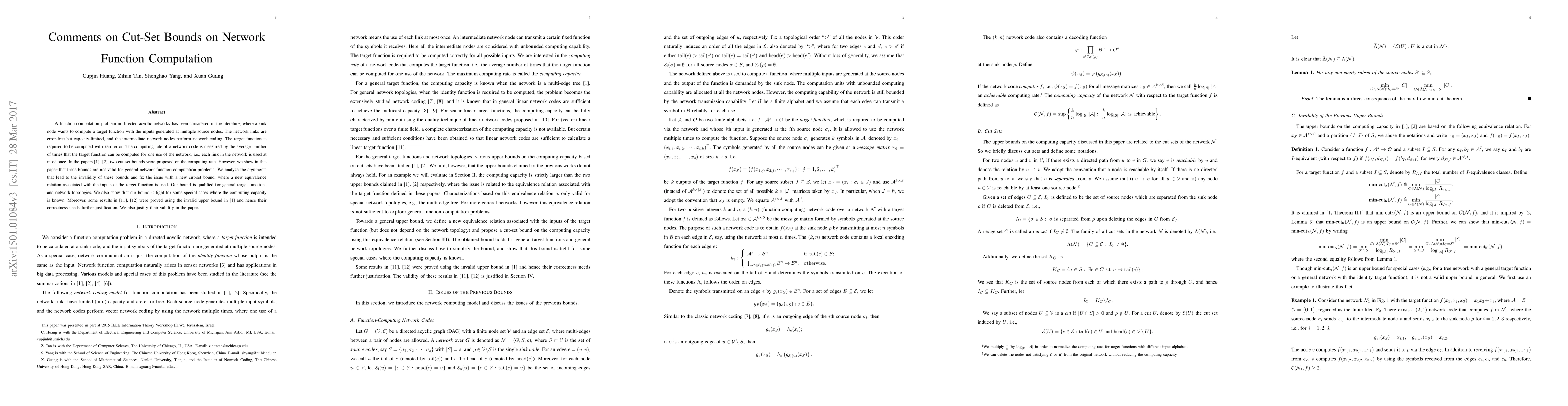 A function computation problem in directed acyclic networks has been considered in the literature, where a sink node wants to compute a target function with the inputs generated at multiple source nodes. The network links are error-free but capacity-limited, and the intermediate network nodes perform network coding. The target function is required to be computed with zero error. The computing rate of a network code is measured by the average number of times that the target function can be computed for one use of the network, i.e., each link in the network is used at most once. In the papers [1], [2], two cut-set bounds were proposed on the computing rate. However, we show in this paper that these bounds are not valid for general network function computation problems. We analyze the arguments that lead to the invalidity of these bounds and fix the issue with a new cut-set bound, where a new equivalence relation associated with the inputs of the target function is used. Our bound is qualified for general target functions and network topologies. We also show that our bound is tight for some special cases where the computing capacity is known. Moreover, some results in [11], [12] were proved using the invalid upper bound in [1] and hence their correctness needs further justification. We also justify their validity in the paper.