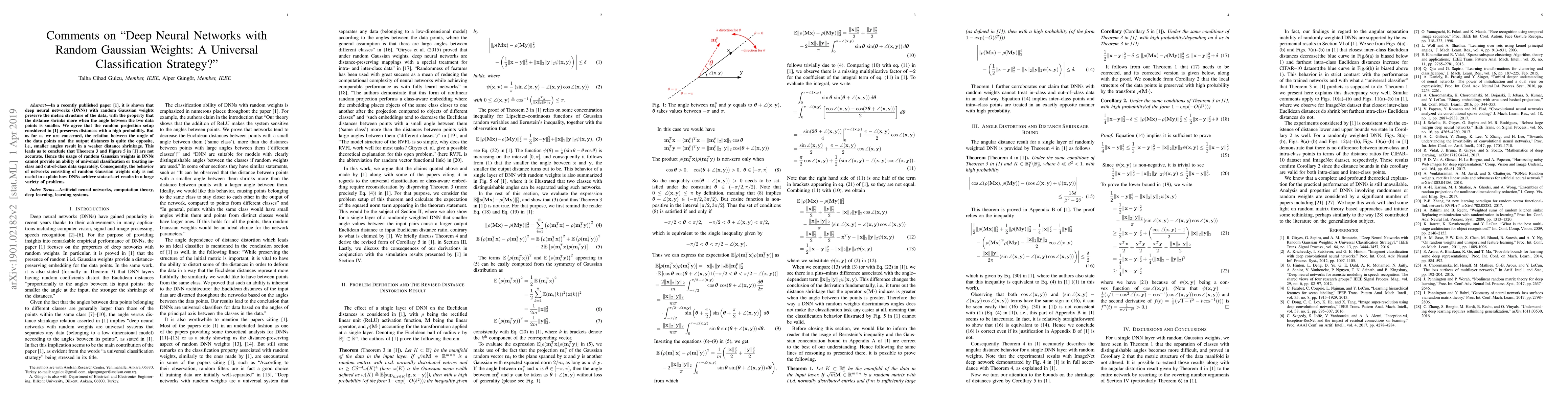 In a recently published paper [1], it is shown that deep neural networks (DNNs) with random Gaussian weights preserve the metric structure of the data, with the property that the distance shrinks more when the angle between the two data points is smaller. We agree that the random projection setup considered in [1] preserves distances with a high probability. But as far as we are concerned, the relation between the angle of the data points and the output distances is quite the opposite, i.e., smaller angles result in a weaker distance shrinkage. This leads us to conclude that Theorem 3 and Figure 5 in [1] are not accurate. Hence the usage of random Gaussian weights in DNNs cannot provide an ability of universal classification or treating in-class and out-of-class data separately. Consequently, the behavior of networks consisting of random Gaussian weights only is not useful to explain how DNNs achieve state-of-art results in a large variety of problems.