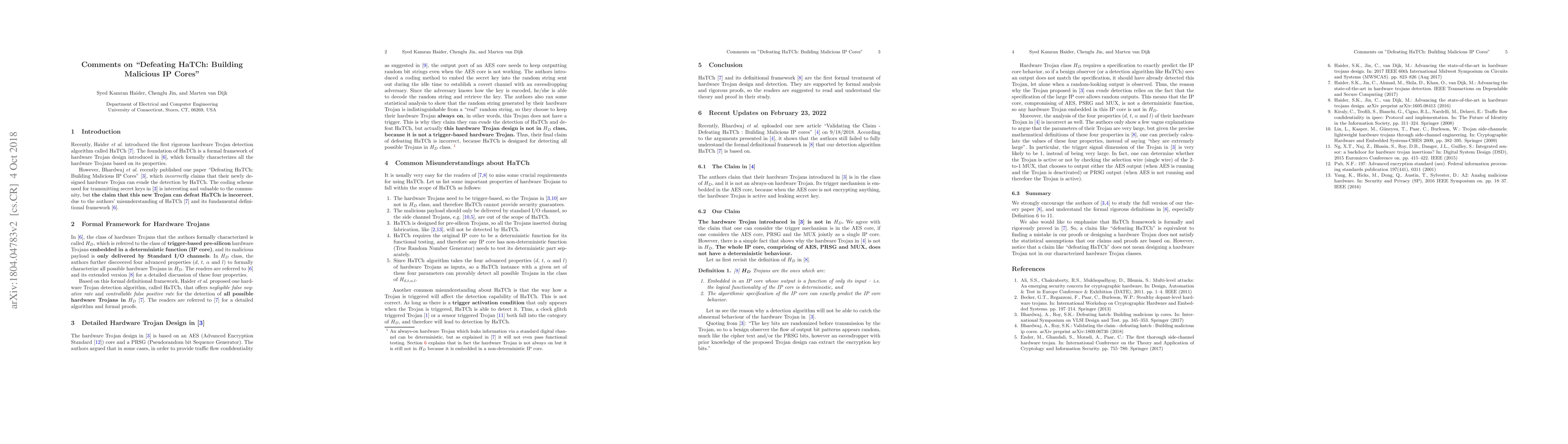Recently, Haider et al. introduced the first rigorous hardware Trojan detection algorithm called HaTCh. The foundation of HaTCh is a formal framework of hardware Trojan design, which formally characterizes all the hardware Trojans based on its properties. However, Bhardwaj et al. recently published one paper "Defeating HaTCh: Building Malicious IP Cores", which incorrectly claims that their newly designed hardware Trojan can evade the detection by HaTCh. In this paper, we explain why the claim of "defeating HaTCh" is incorrect, and we clarify several common misunderstandings about HaTCh.