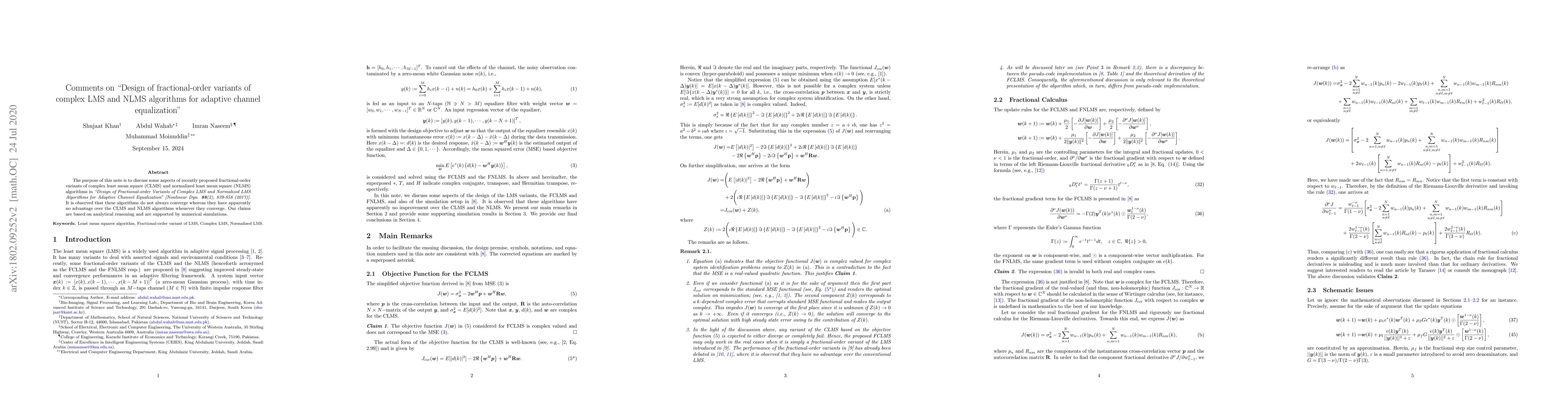 The purpose of this note is to discuss some aspects of recently proposed fractional-order variants of complex least mean square (CLMS) and normalized least mean square (NLMS) algorithms in ``Design of Fractional-order Variants of Complex LMS and Normalized LMS Algorithms for Adaptive Channel Equalization'' [Nonlinear Dyn. 88(2), 839-858 (2017)]. It is observed that these algorithms do not always converge whereas they have apparently no advantage over the CLMS and NLMS algorithms whenever they converge. Our claims are based on analytical reasoning and are supported by numerical simulations.