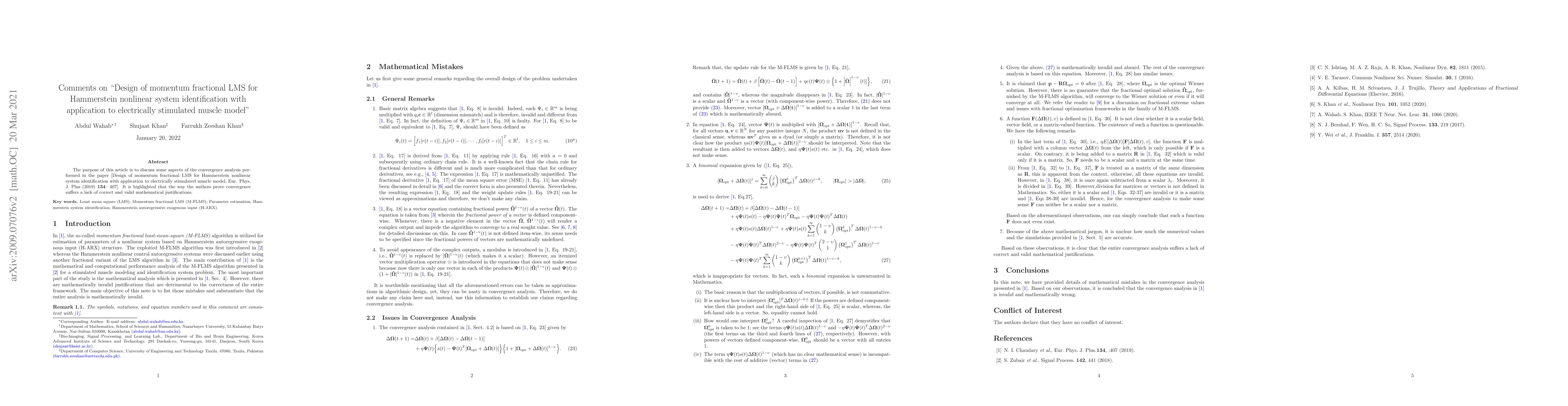The purpose of this article is to discuss some aspects of the convergence analysis performed in the paper [Design of momentum fractional LMS for Hammerstein nonlinear system identification with application to electrically stimulated muscle model, Eur. Phys. J. Plus (2019) \textbf{134}: 407]. It is highlighted that the way the authors prove convergence suffers a lack of correct and valid mathematical justifications.
