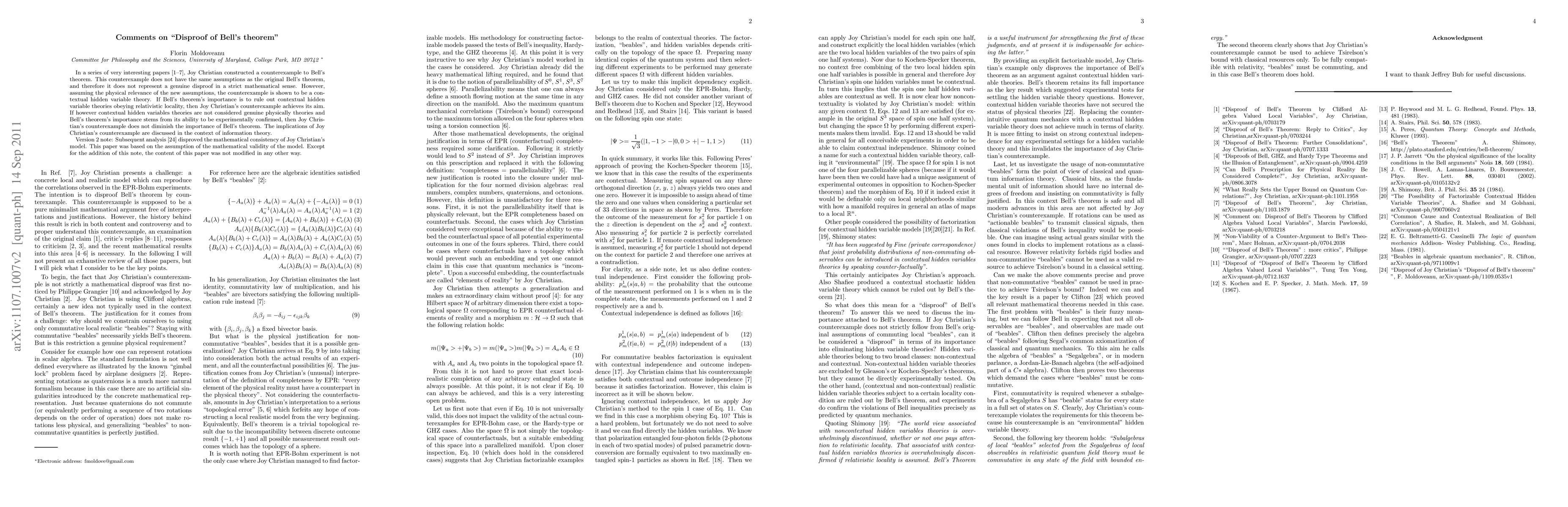 This paper critiques Joy Christian's proposed counterexample to Bell's theorem, arguing it does not strictly disprove the theorem due to differing assumptions. However, if contextual hidden variable theories are deemed relevant, Christian's work succeeds in challenging Bell's theorem. Subsequent analysis has since shown mathematical inconsistencies in Christian's model.