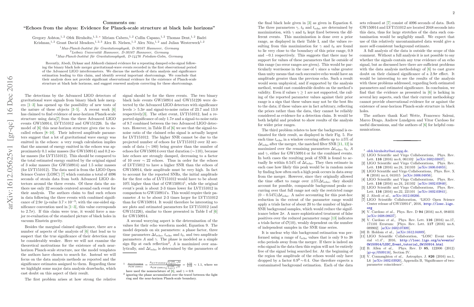 Recently, Abedi, Dykaar and Afshordi claimed evidence for a repeating damped echo signal following the binary black hole merger gravitational-wave events recorded in the first observational period of the Advanced LIGO interferometers. We discuss the methods of data analysis and significance estimation leading to this claim, and identify several important shortcomings. We conclude that their analysis does not provide significant observational evidence for the existence of Planck-scale structure at black hole horizons, and suggest renewed analysis correcting for these shortcomings.