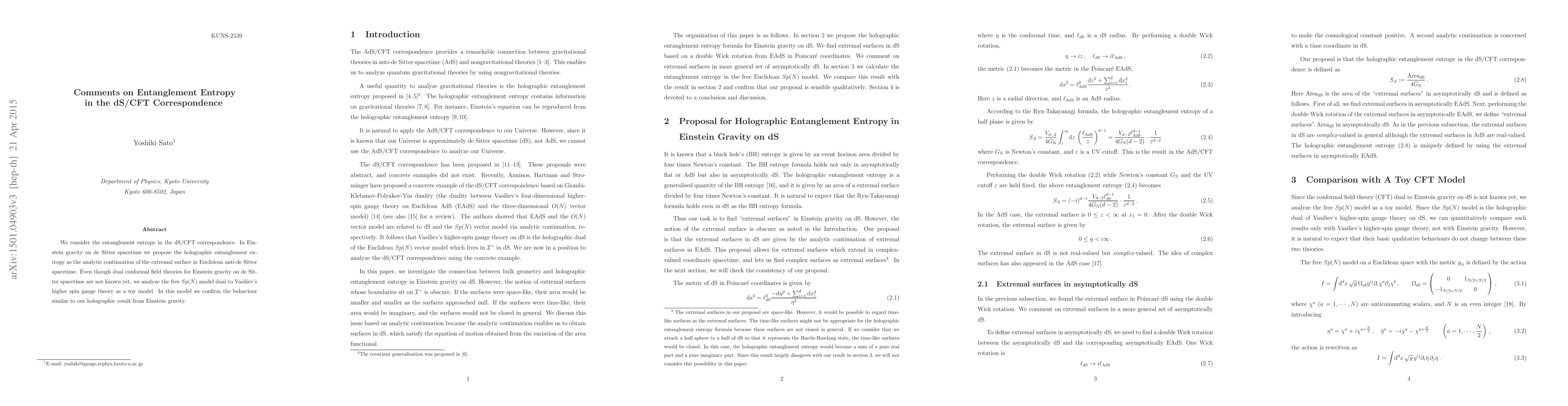 We consider the entanglement entropy in the dS/CFT correspondence.In Einstein gravity on de Sitter spacetime we propose the holographic entanglement entropy as the analytic continuation of the extremal surface in Euclidean anti-de Sitter spacetime.Even though dual conformal field theories for Einstein gravity on de Sitter spacetime have not been known yet,we analyzed the free $Sp(N)$ model dual to Vasiliev's higher spin gauge theory as a toy model.In this model we confirmed the behaviour similar to our holographic result from Einstein gravity.