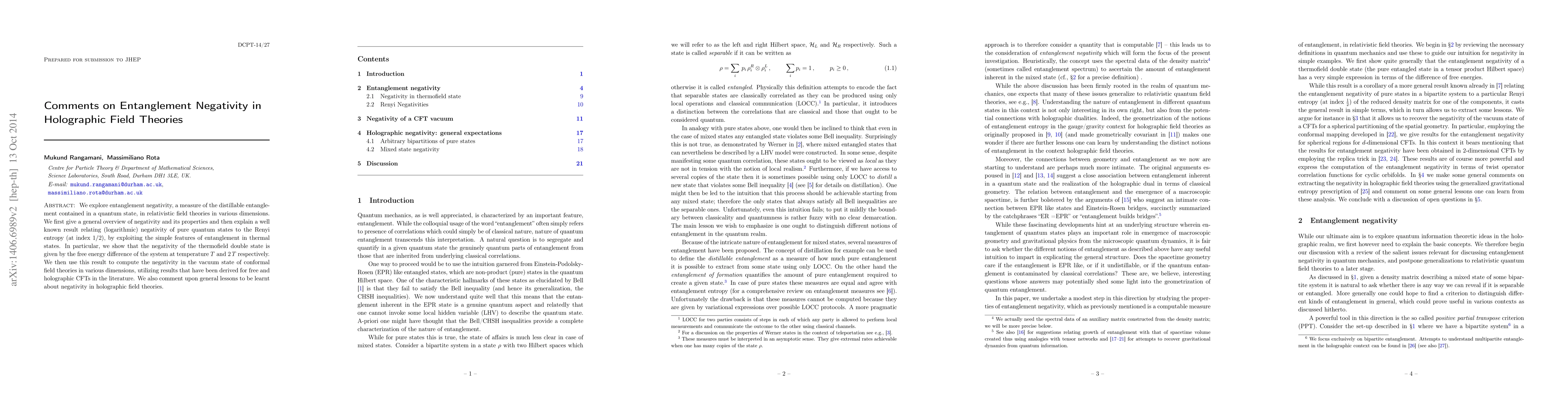 This paper investigates entanglement negativity in relativistic field theories, establishing its relation to Renyi entropy and free energy differences. It computes negativity in the vacuum state of conformal field theories across dimensions, drawing insights from existing holographic CFT results.