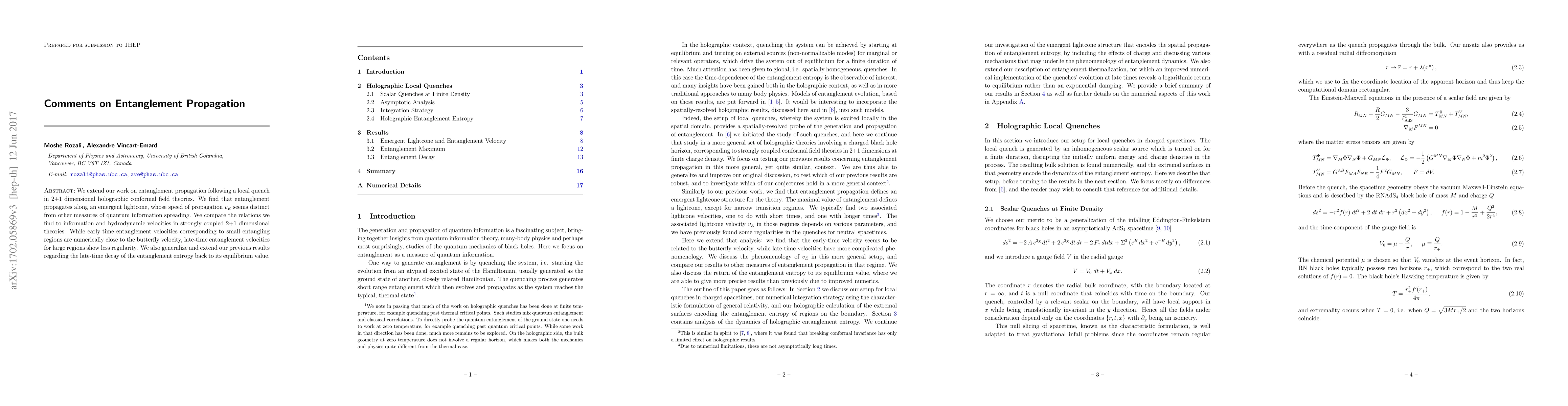 We extend our work on entanglement propagation following a local quench in 2+1 dimensional holographic conformal field theories. We find that entanglement propagates along an emergent lightcone, whose speed of propagation $v_E$ seems distinct from other measures of quantum information spreading. We compare the relations we find to information and hydrodynamic velocities in strongly coupled 2+1 dimensional theories. While early-time entanglement velocities corresponding to small entangling regions are numerically close to the butterfly velocity, late-time entanglement velocities for large regions show less regularity. We also generalize and extend our previous results regarding the late-time decay of the entanglement entropy back to its equilibrium value.