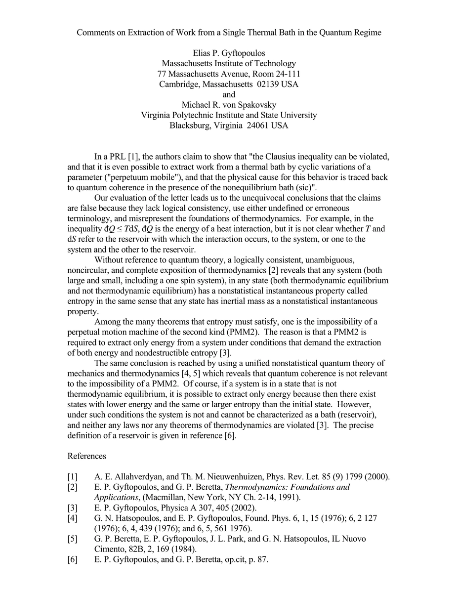 In a PRL [1], the authors claim to show that "the Clausius inequality can be violated, and that it is even possible to extract work from a thermal bath by cyclic variations of a parameter ("perpetuum mobile"), and that the physical cause for this behavior is traced back to quantum coherence in the presence of the nonequilibrium bath (sic)".