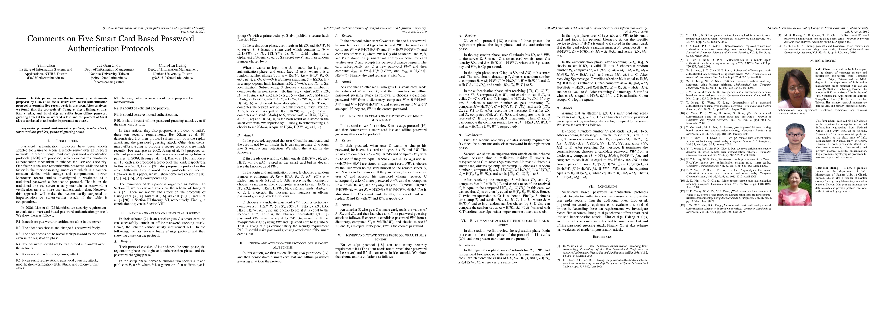 This paper evaluates five recent smart card-based password authentication protocols against ten security requirements, finding that four protocols are vulnerable to offline password guessing attacks, while one is susceptible to insider impersonation attacks.
