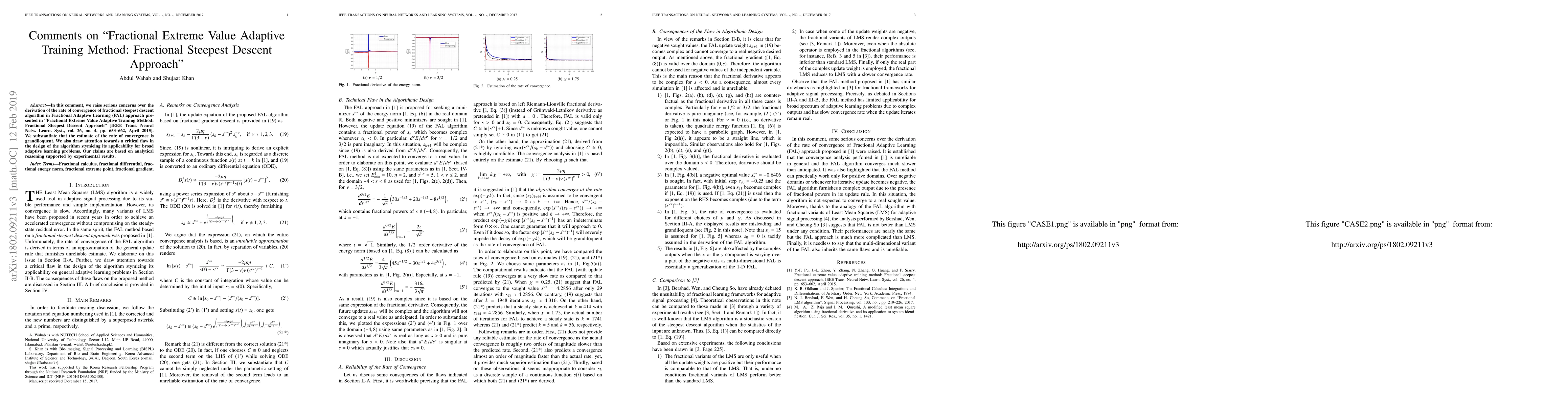This comment critiques the convergence rate derivation in the fractional steepest descent algorithm of the fractional adaptive learning approach, arguing that the convergence rate estimate is exaggerated and highlighting a design flaw that limits the algorithm's applicability. The critique is substantiated with analytical reasoning and experimental evidence.