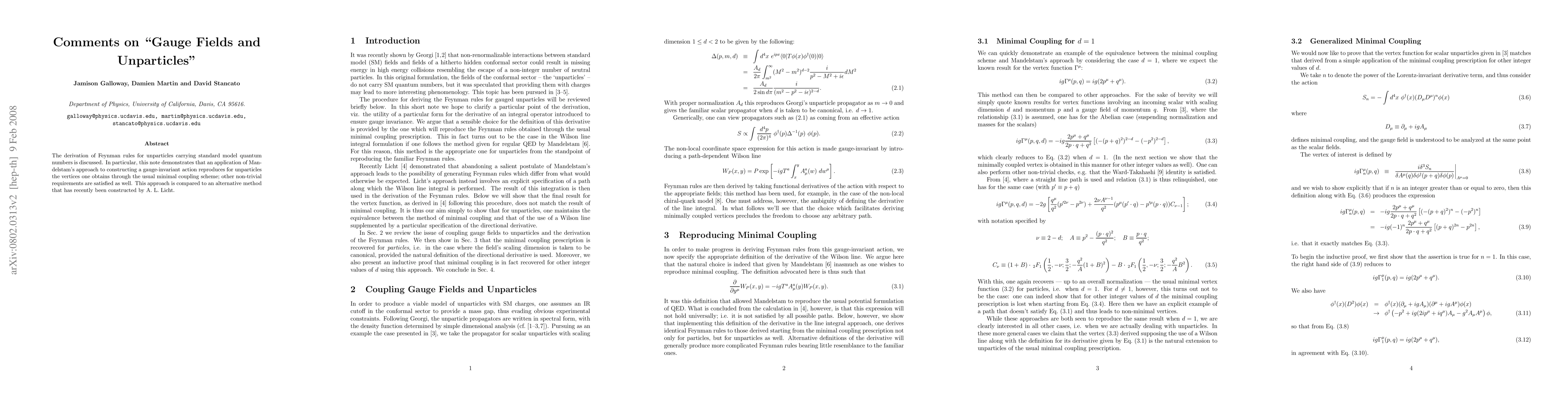 The derivation of Feynman rules for unparticles carrying standard model quantum numbers is discussed. In particular, this note demonstrates that an application of Mandelstam's approach to constructing a gauge-invariant action reproduces for unparticles the vertices one obtains through the usual minimal coupling scheme; other non-trivial requirements are satisfied as well. This approach is compared to an alternative method 0801.0892 that has recently been constructed by A. L. Licht.