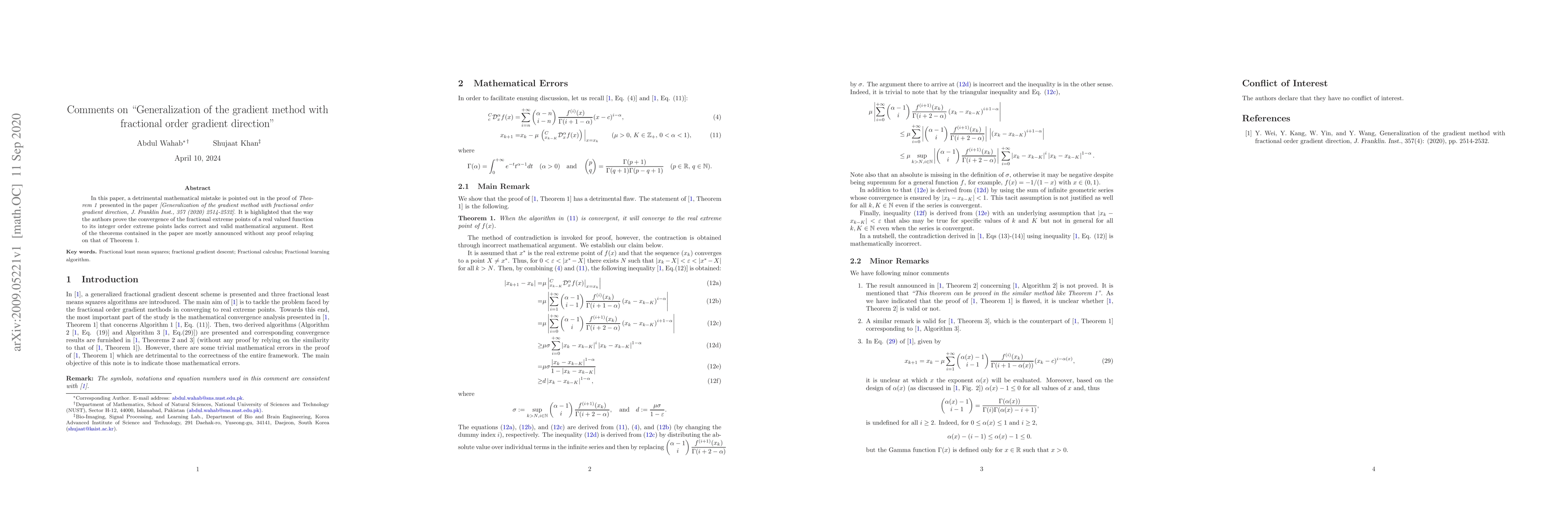 In this paper, a detrimental mathematical mistake is pointed out in the proof of \textit{Theorem 1} presented in the paper\textit{ [Generalization of the gradient method with fractional order gradient direction, J. Franklin Inst., 357 (2020) 2514-2532]}. It is highlighted that the way the authors prove the convergence of the fractional extreme points of a real valued function to its integer order extreme points lacks correct and valid mathematical argument. Rest of the theorems contained in the paper are mostly announced without any proof relaying on that of Theorem 1.