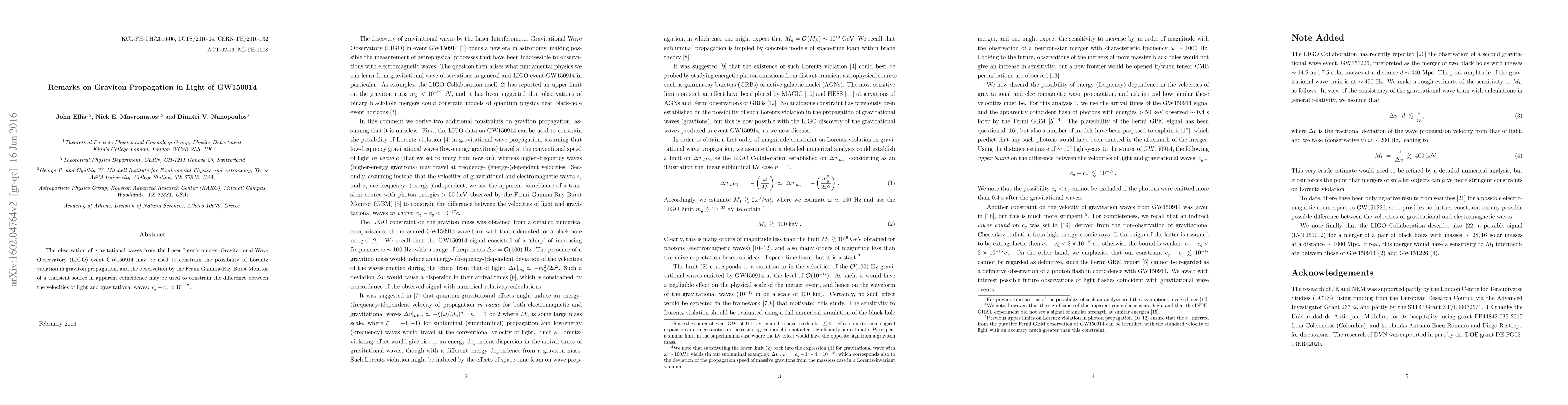 The observation of gravitational waves from the Laser Interferometer Gravitational-Wave Observatory (LIGO) event GW150914 may be used to constrain the possibility of Lorentz violation in graviton propagation, and the observation by the Fermi Gamma-Ray Burst Monitor of a transient source in apparent coincidence may be used to constrain the difference between the velocities of light and gravitational waves: $c_g - c_\gamma < 10^{-17}$.