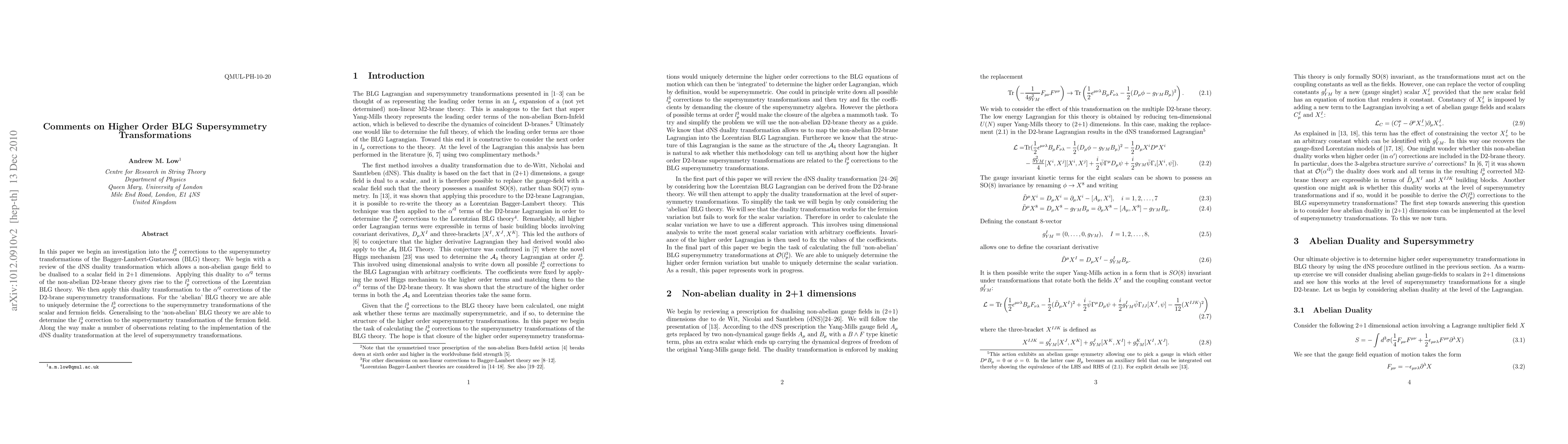 In this paper we begin an investigation into the $l_p^3$ corrections to the supersymmetry transformations of the Bagger-Lambert-Gustavsson (BLG) theory. We begin with a review of the dNS duality transformation which allows a non-abelian gauge field to be dualised to a scalar field in 2+1 dimensions. Applying this duality to $\alpha'^2$ terms of the non-abelian D2-brane theory gives rise to the $l_p^3$ corrections of the Lorentzian BLG theory. We then apply this duality transformation to the $\alpha'^2$ corrections of the D2-brane supersymmetry transformations. For the `abelian' BLG theory we are able to uniquely determine the $l_p^3$ corrections to the supersymmetry transformations of the scalar and fermion fields. Generalising to the `non-abelian' BLG theory we are able to determine the $l_p^3$ correction to the supersymmetry transformation of the fermion field. Along the way make a number of observations relating to the implementation of the dNS duality transformation at the level of supersymmetry transformations.