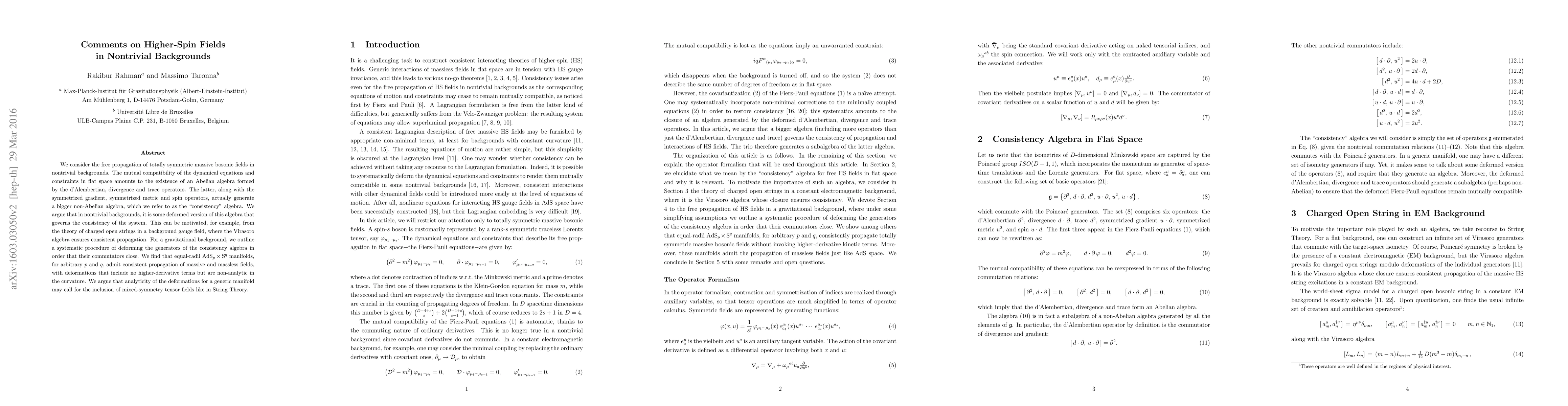 We consider the free propagation of totally symmetric massive bosonic fields in nontrivial backgrounds. The mutual compatibility of the dynamical equations and constraints in flat space amounts to the existence of an Abelian algebra formed by the d'Alembertian, divergence and trace operators. The latter, along with the symmetrized gradient, symmetrized metric and spin operators, actually generate a bigger non-Abelian algebra, which we refer to as the "consistency" algebra. We argue that in nontrivial backgrounds, it is some deformed version of this algebra that governs the consistency of the system. This can be motivated, for example, from the theory of charged open strings in a background gauge field, where the Virasoro algebra ensures consistent propagation. For a gravitational background, we outline a systematic procedure of deforming the generators of the consistency algebra in order that their commutators close. We find that equal-radii AdSp X Sq manifolds, for arbitrary p and q, admit consistent propagation of massive and massless fields, with deformations that include no higher-derivative terms but are non-analytic in the curvature. We argue that analyticity of the deformations for a generic manifold may call for the inclusion of mixed-symmetry tensor fields like in String Theory.