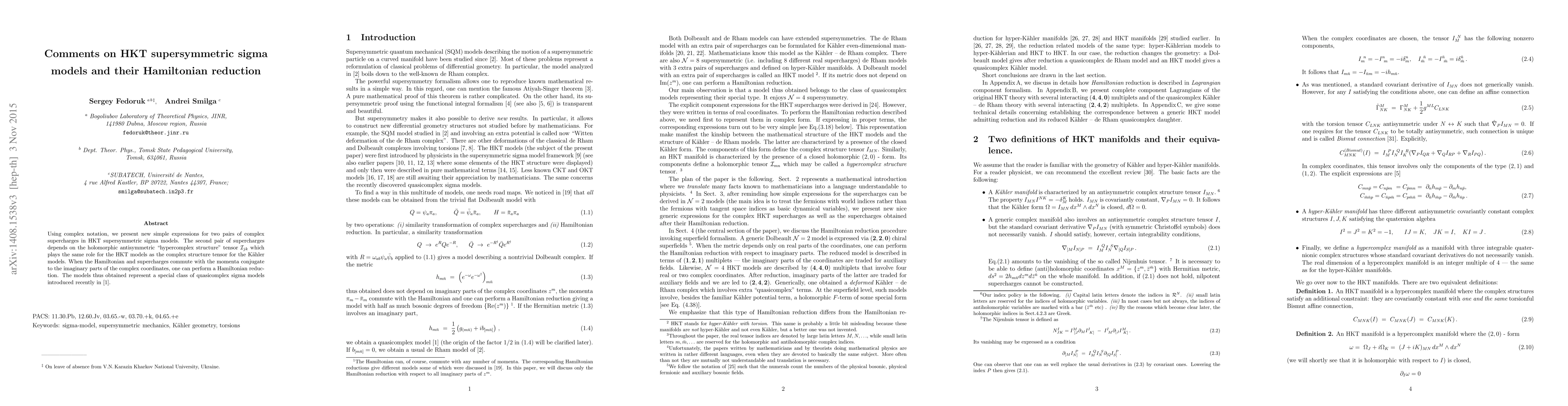 This paper introduces new expressions for complex supercharges in HKT supersymmetric sigma models, emphasizing the role of the hypercomplex structure tensor. It also discusses Hamiltonian reduction when supercharges commute with certain momenta, leading to a class of quasicomplex sigma models.