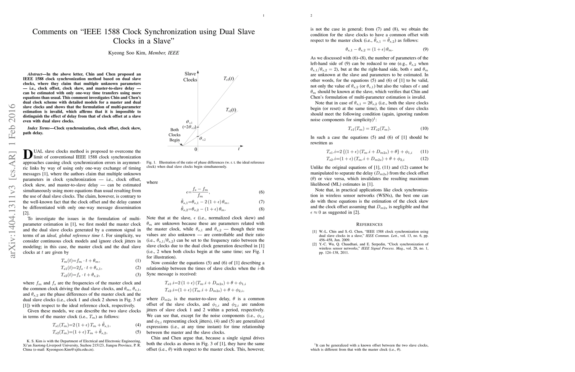 This comment critiques Chin and Chen's IEEE 1588 clock synchronization method using dual slave clocks, demonstrating that their proposed multi-parameter estimation through one-way time transfers is invalid due to the inability to distinguish delay effects from clock offset.