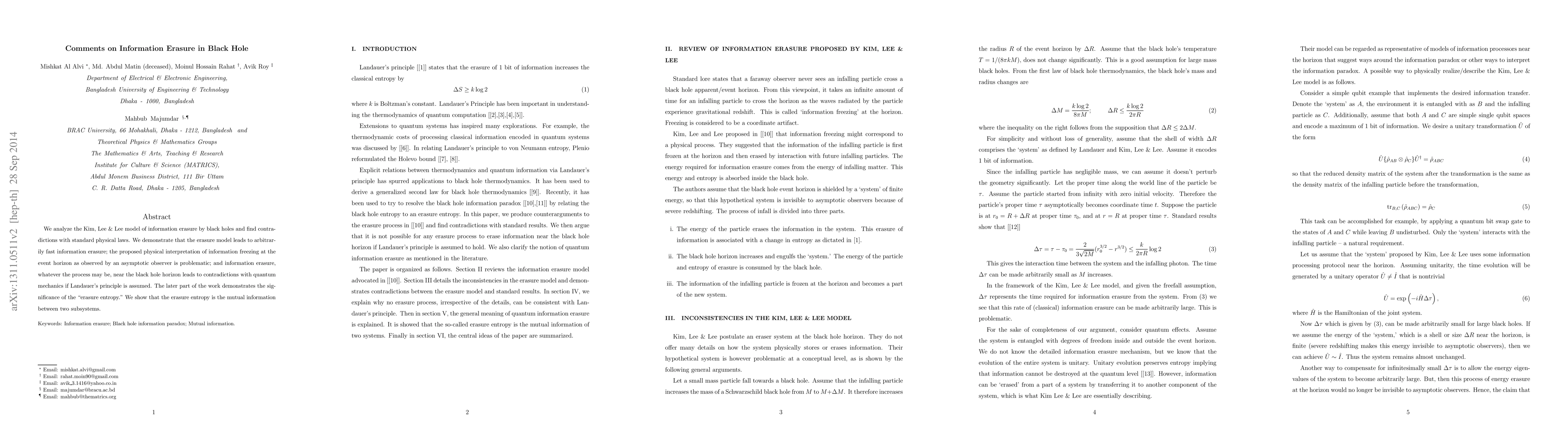 This paper critiques the Kim, Lee & Lee model of information erasure by black holes, finding it conflicts with standard physical laws and quantum mechanics, particularly Landauer's principle. It highlights issues with the proposed information freezing at the event horizon and introduces the concept of "erasure entropy" as mutual information between subsystems.