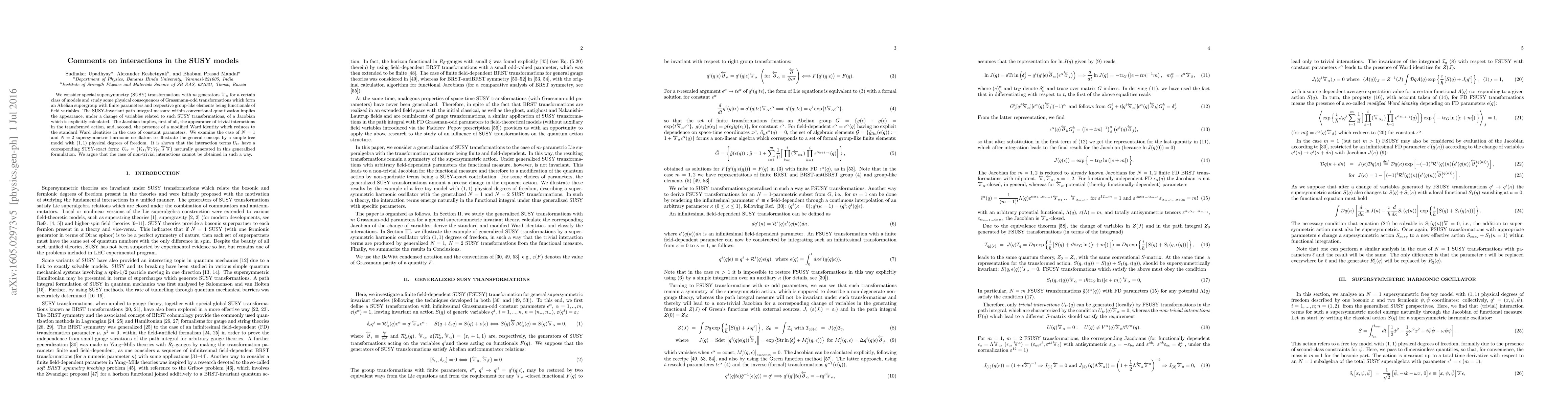 We consider special supersymmetry (SUSY) transformations with $m$ generators $\overleftarrow{s}_{\alpha }$ for a certain class of models and study some physical consequences of Grassmann-odd transformations which form an Abelian supergroup with finite parameters and respective group-like elements being functionals of field variables. The SUSY-invariant path integral measure within conventional quantization implies the appearance, under a change of variables related to such SUSY transformations, of a Jacobian which is explicitly calculated. The Jacobian implies, first of all, the appearance of trivial interactions in the transformed action, and, second, the presence of a modified Ward identity which reduces to the standard Ward identities in the case of constant parameters. We examine the case of ${N}=1$ and $N=2$ supersymmetric harmonic oscillators to illustrate the general concept by a simple free model with $(1,1)$ physical degrees of freedom. It is shown that the interaction terms $U_{tr}$ have a corresponding SUSY-exact form: $U_{tr}=% \big(V_{(1)}\overleftarrow{s};V_{(2)}\overleftarrow{\bar{s}}\overleftarrow{s}% \big)$ naturally generated in this generalized formulation. We argue that the case of non-trivial interactions cannot be obtained in such a way.