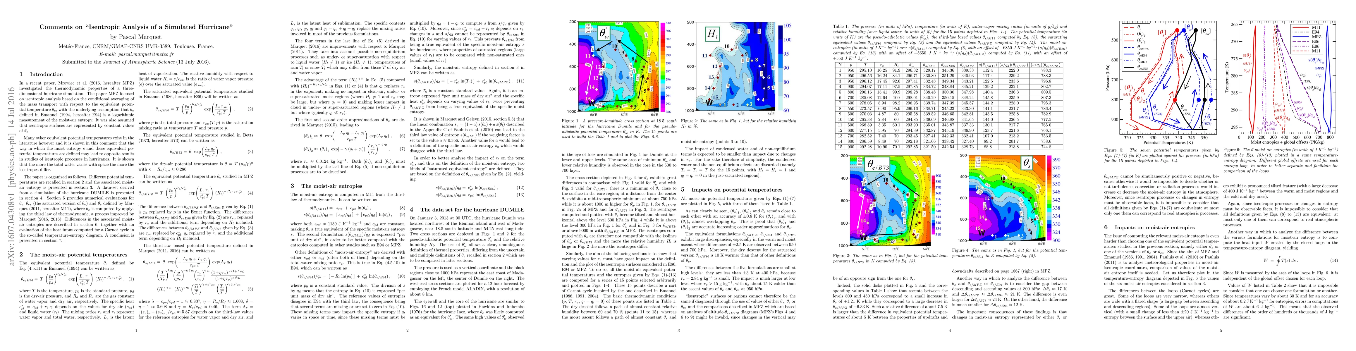 This paper describes Comments to the paper of Mrowiec et al. published in the J. Atmos. Sci. in May 2016 (Vol 73, Issue 5, pages 1857-1870) and entitled "Isentropic analysis of a simulated hurricane". It is explained that the plotting of isentropic surfaces (namely the isentropes) requires a precise definition of the specific moist-air entropy, and that most of existing "equivalent potential temperatures" lead to inaccurate definitions of isentropes. It is shown that the use of the third law of thermodynamics leads to a definition of the specific moist-air entropy (and of a corresponding potential temperature) which allow the plotting of unambigous moist-air isentropes. Numerical applications are shown by using a numerical simulation of the hurricane DUMILE.