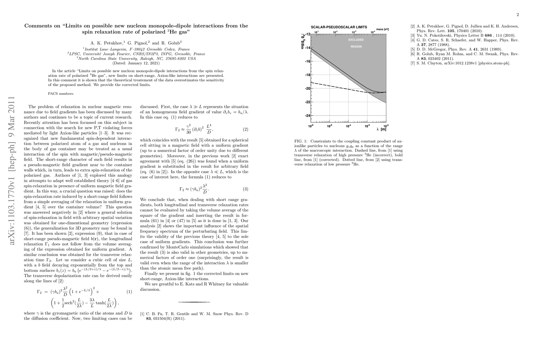 In the article "Limits on possible new nucleon monopole-dipole interactions from the spin relaxation rate of polarized $^3$He gas", new limits on short-range, Axion-like interactions are presented. In this comment it is shown that the theoretical treatement of the data overestimates the sensitivity of the proposed method. We provide the corrected limits.