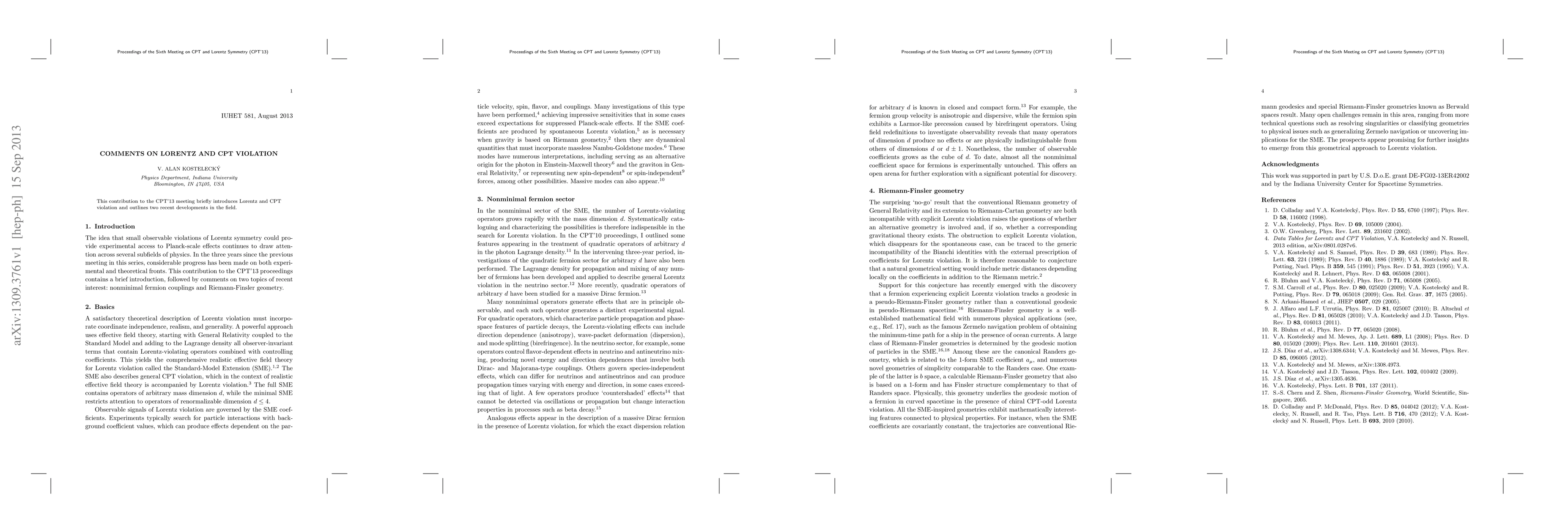 This contribution to the CPT'13 meeting briefly introduces Lorentz and CPT violation and outlines two recent developments in the field.