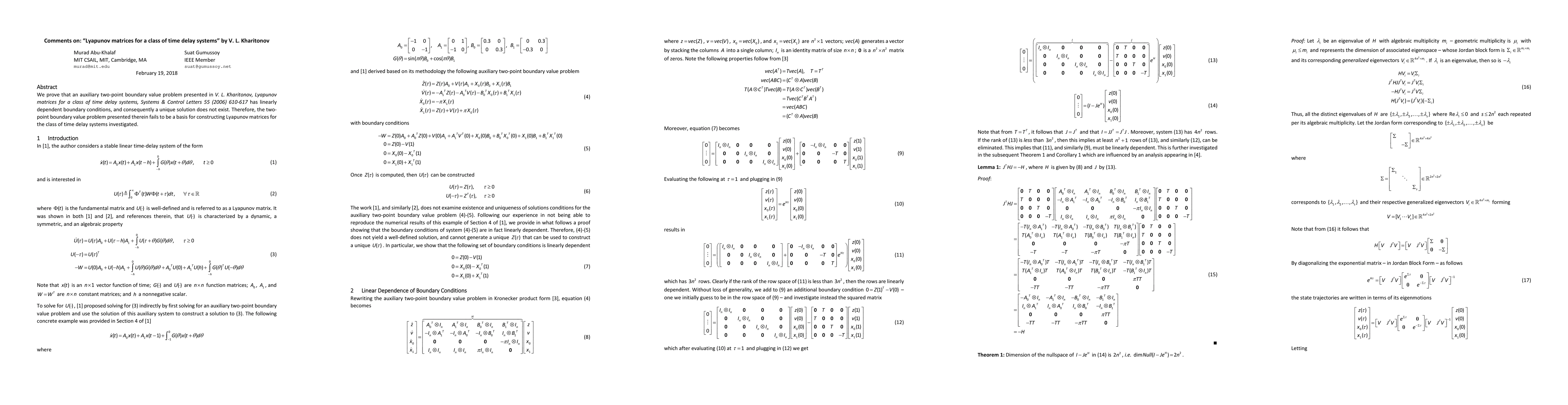 This paper disproves the uniqueness of solutions in a two-point boundary value problem proposed by V.L. Kharitonov for time delay systems, rendering it unsuitable for constructing Lyapunov matrices as initially claimed.