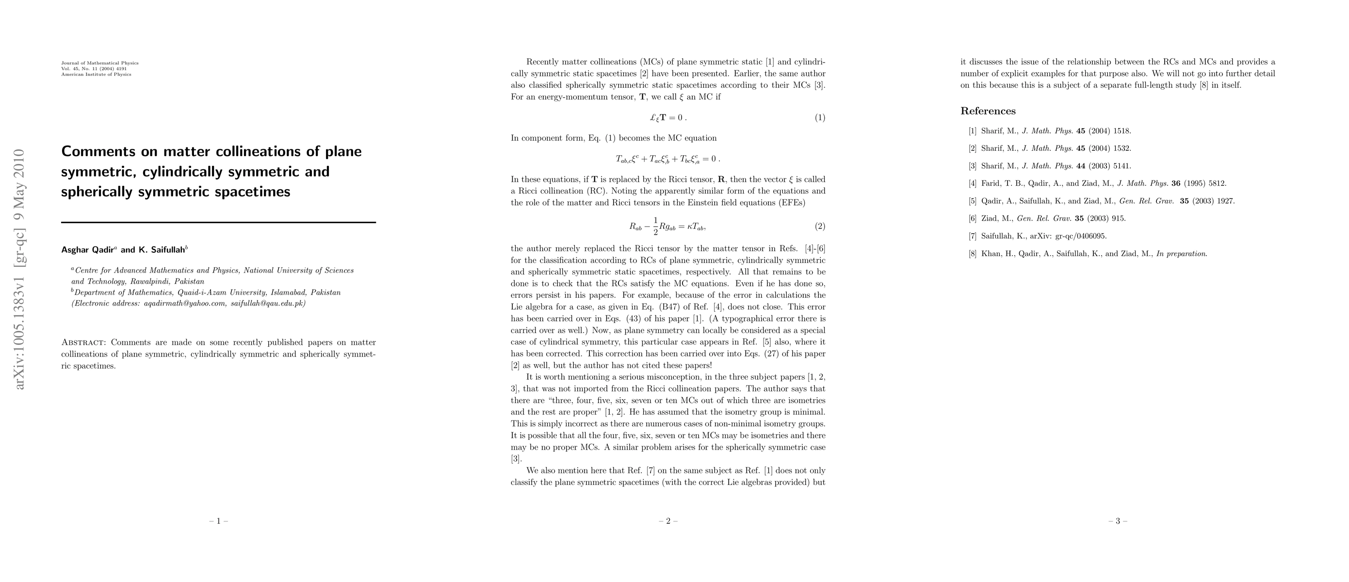Summary: This paper provides critical commentary on recent studies concerning matter collineations in plane, cylindrical, and spherically symmetric spacetimes. It evaluates the methodologies and conclusions drawn from these earlier works.