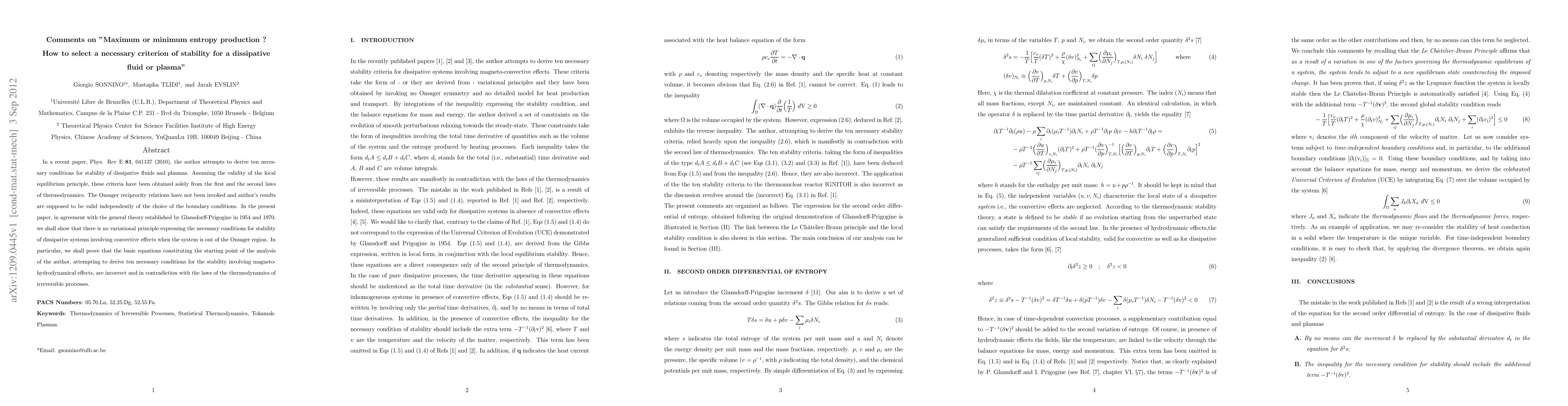 In a recent paper, Phys. Rev E 81, 041137 (2010), the author attempts to derive ten necessary conditions for stability of dissipative fluids and plasmas. Assuming the validity of the local equilibrium principle, these criteria have been obtained solely from the first and the second laws of thermodynamics. The Onsager reciprocity relations have not been invoked and author's results are supposed to be valid independently of the choice of the boundary conditions. In the present paper, in agreement with the general theory established by Glansdorff-Prigogine in 1954 and 1970, we shall show that there is no variational principle expressing the necessary conditions for stability of dissipative systems involving convective effects when the system is out of the Onsager region. In particular, we shall prove that the basic equations constituting the starting point of the analysis of the author, attempting to derive ten necessary conditions for the stability involving magneto-hydrodynamical effects, are incorrect and in contradiction with the laws of the thermodynamics of irreversible processes.
