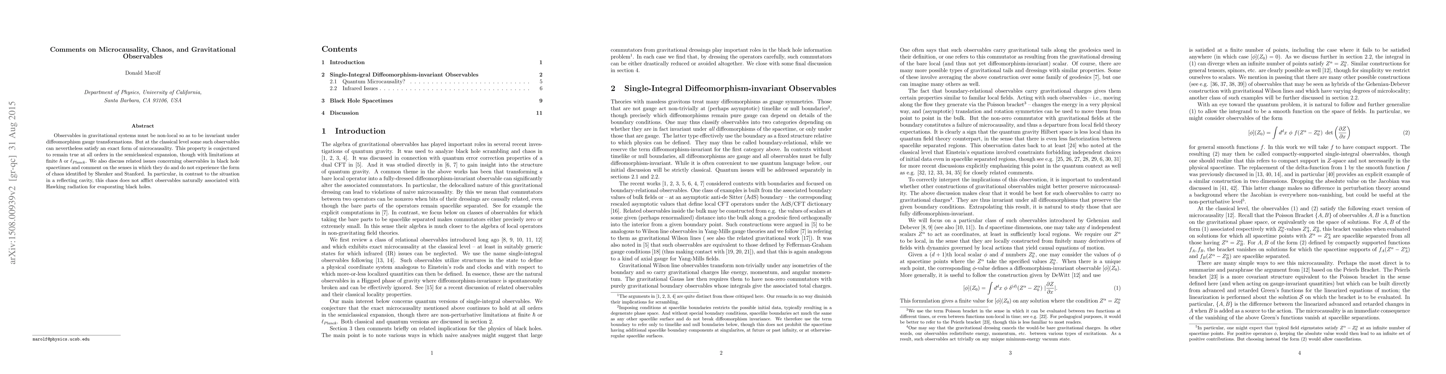 Observables in gravitational systems must be non-local so as to be invariant under diffeomorphism gauge transformations. But at the classical level some such observables can nevertheless satisfy an exact form of microcausality. This property is conjectured to remain true at all orders in the semiclassical expansion, though with limitations at finite $\hbar$ or $\ell_{Planck}$. We also discuss related issues concerning observables in black hole spacetimes and comment on the senses in which they do and do not experience the form of chaos identified by Shenker and Stanford. In particular, in contrast to the situation in a reflecting cavity, this chaos does not afflict observables naturally associated with Hawking radiation for evaporating black holes.