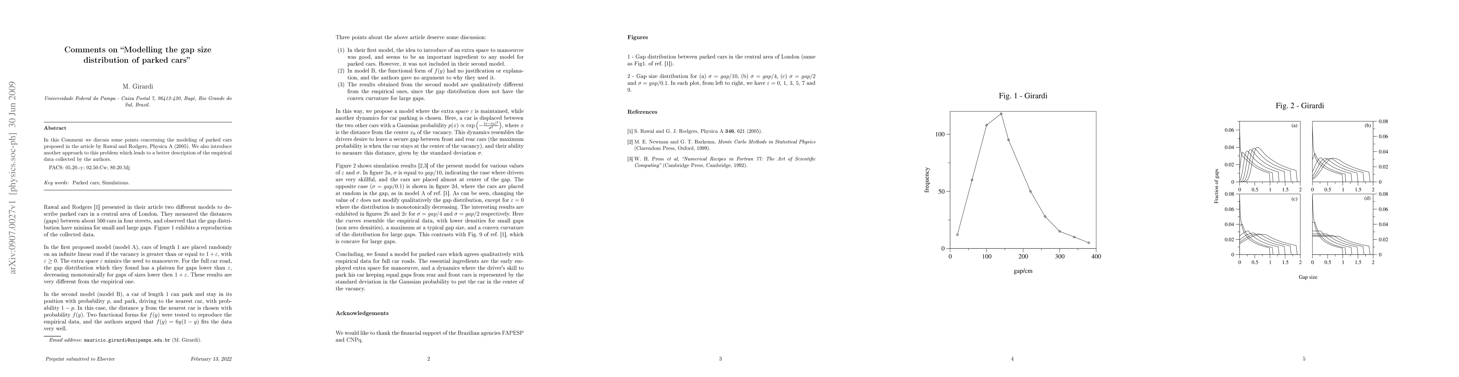Researchers discuss limitations of a model for parked car gap size distribution and propose an alternative approach that better describes empirical data.