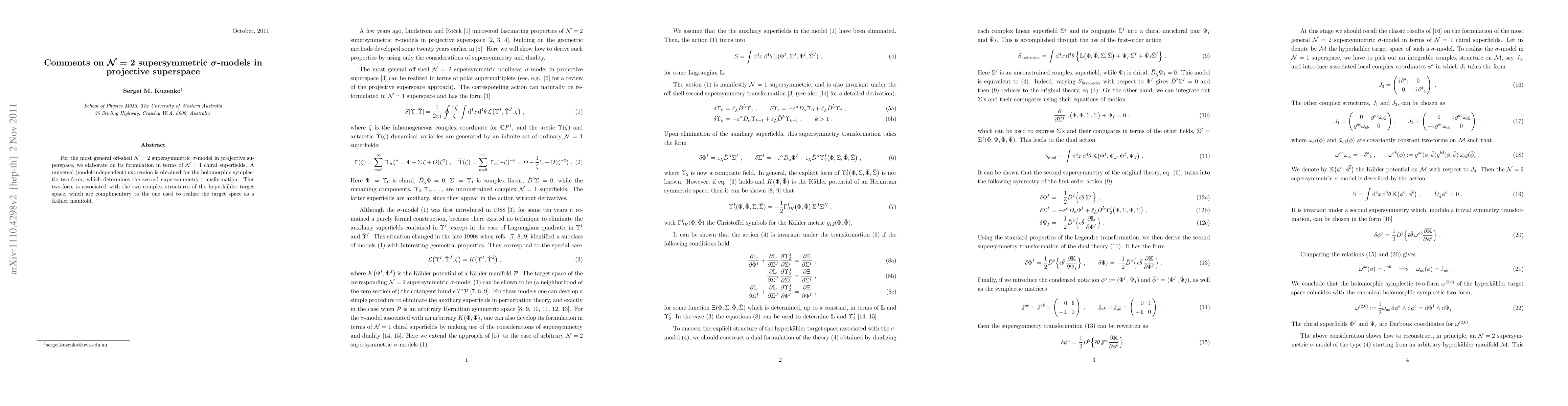 For the most general off-shell N = 2 supersymmetric sigma model in projective superspace, we elaborate on its formulation in terms of N = 1 chiral superfields. A universal (model-independent) expression is obtained for the holomorphic symplectic two-form, which determines the second supersymmetry transformation. This two-form is associated with the two complex structures of the hyperkahler target space, which are complimentary to the one used to realize the target space as a Kahler manifold.