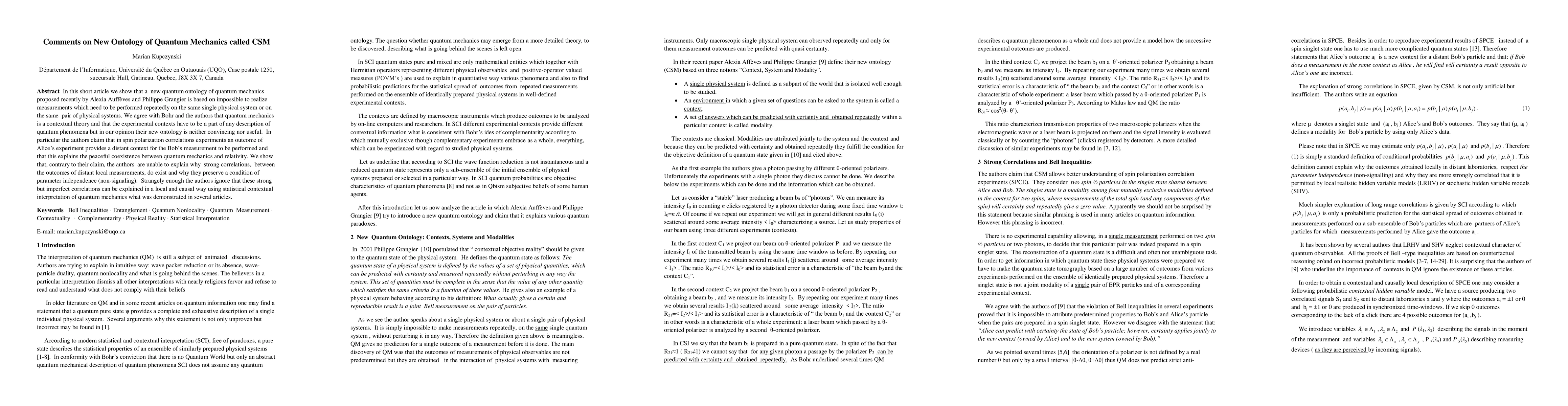 Title: Comments on New Ontology of Quantum Mechanics called CSM Summary: The paper critiques a new quantum ontology based on impossible measurements, arguing it fails to convincingly explain quantum phenomena and the coexistence with relativity, while ignoring existing local and causal explanations.