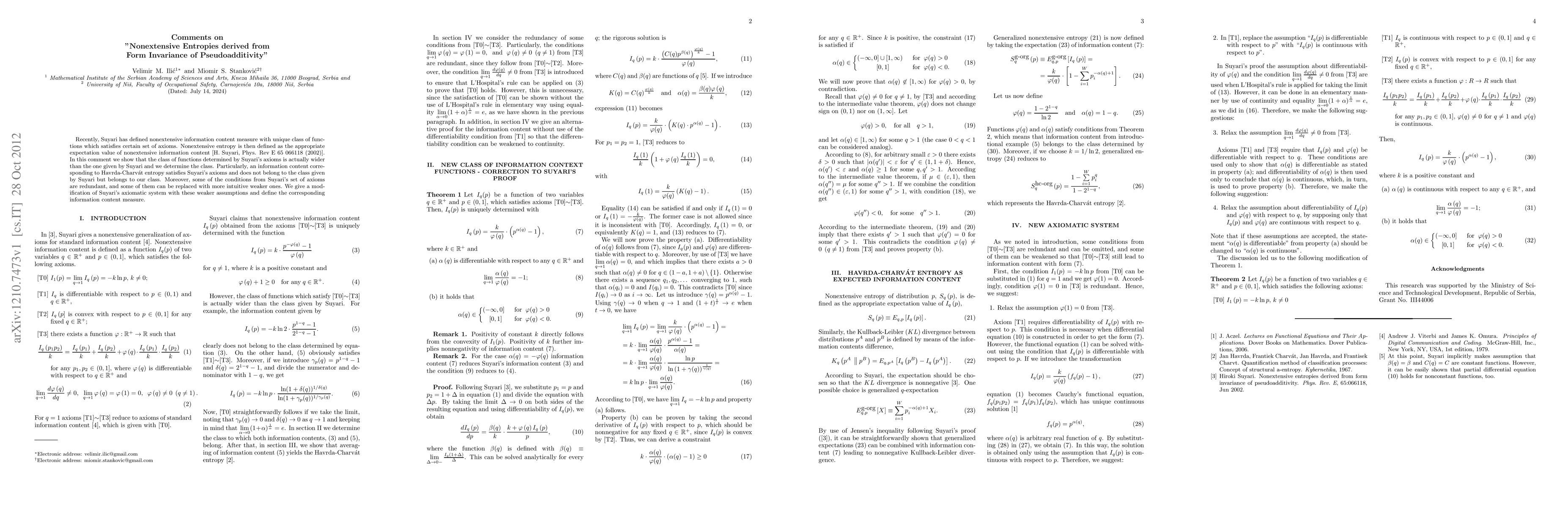 Recently, Suyari has defined nonextensive information content measure with unique class of functions which satisfies certain set of axioms. Nonextensive entropy is then defined as the appropriate expectation value of nonextensive information content [H. Suyari, Phys. Rev E 65 066118 (2002)]. In this comment we show that the class of functions determined by Suyari's axioms is actually wider than the one given by Suyari and we determine the class. Particularly, an information content corresponding to Havrda-Charvat entropy satisfies Suyari's axioms and does not belong to the class given by Suyari but belongs to our class. Moreover, some of the conditions from Suyari's set of axioms are redundant, and some of them can be replaced with more intuitive weaker ones. We give a modification of Suyari's axiomatic system with these weaker assumptions and define the corresponding information content measure.
