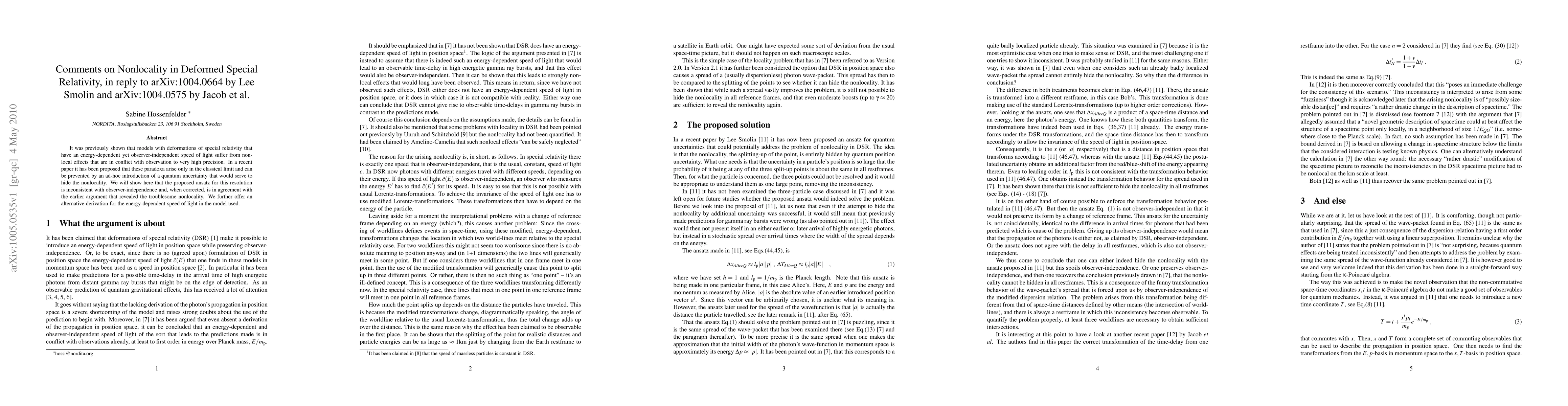 It was previously shown that models with deformations of special relativity that have an energy-dependent yet observer-independent speed of light suffer from nonlocal effects that are in conflict with observation to very high precision. In a recent paper it has been proposed that these paradoxa arise only in the classical limit and can be prevented by an ad-hoc introduction of a quantum uncertainty that would serve to hide the nonlocality. We will show here that the proposed ansatz for this resolution is inconsistent with observer-independence and, when corrected, is in agreement with the earlier argument that revealed the troublesome nonlocality. We further offer an alternative derivation for the energy-dependent speed of light in the model used.