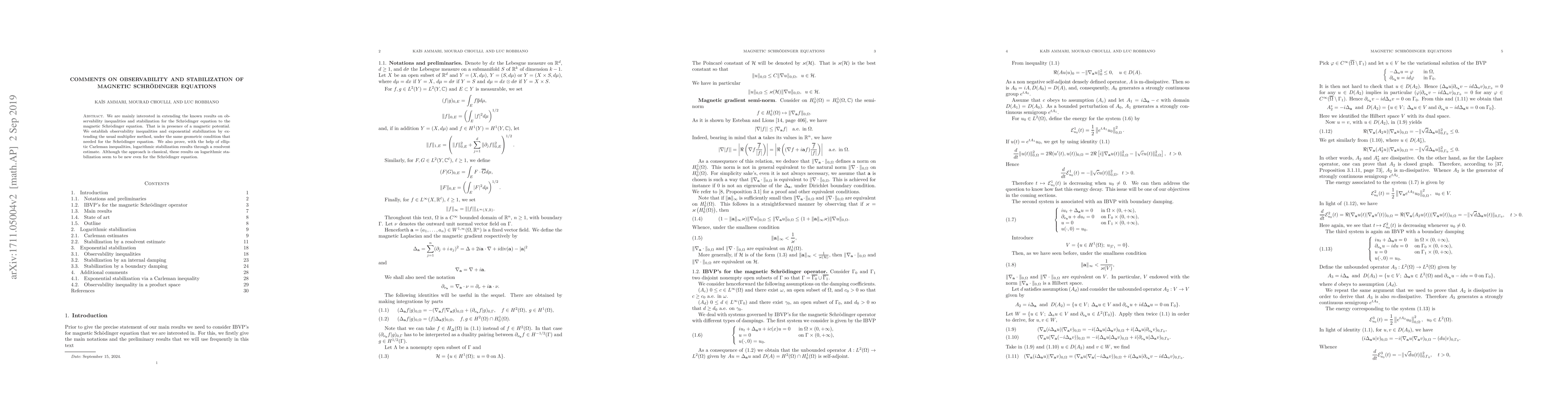 This paper extends observability inequalities and stabilization results for the magnetic Schrödinger equation, incorporating magnetic potentials. It establishes exponential and novel logarithmic stabilization via the multiplier method and elliptic Carleman inequalities, under geometric conditions similar to those for the standard Schrödinger equation.