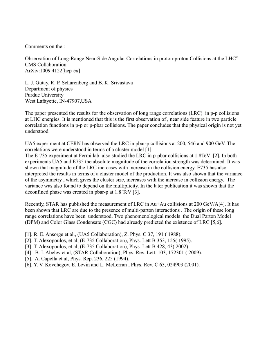 We present comments on the paper "Observation of Long-Range, Near-Side Angular Correlations in proton-proton Collisions at the LHC".
