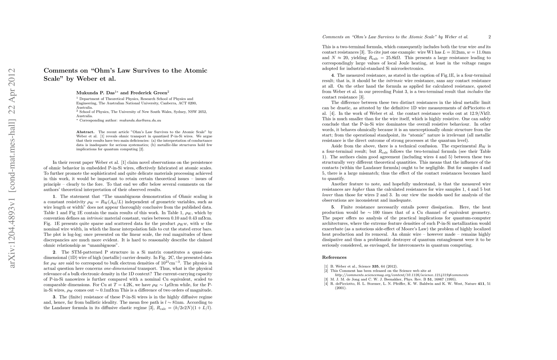 The recent article "Ohm's Law Survives to the Atomic Scale" by Weber et al. [Science 335, 64 (1021)] reveals ohmic transport in quantized P-in-Si wires. We argue that their results have two main deficiencies: (a) the interpretation of conductance data is inadequate for serious systematics; (b) metallic-like structures hold few implications for quantum computing.