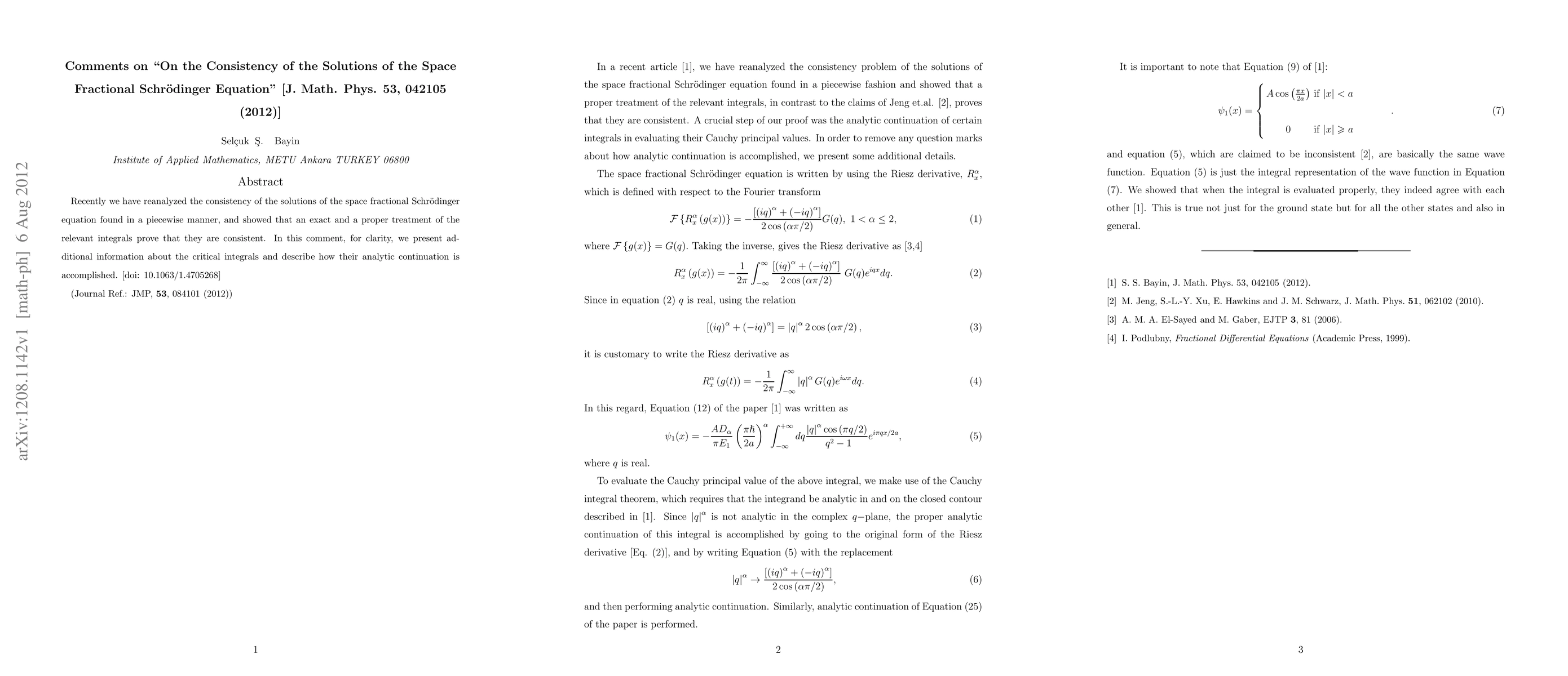 Recently we have reanalyzed the consistency of the solutions of the space fractional Schr\"odinger equation found in a piecewise manner, and showed that an exact and a proper treatment of the relevant integrals prove that they are consistent. In this comment, for clarity, we present additional information about the critical integrals and describe how their analytic continuation is accomplished. [doi: 10.1063/1.4705268]