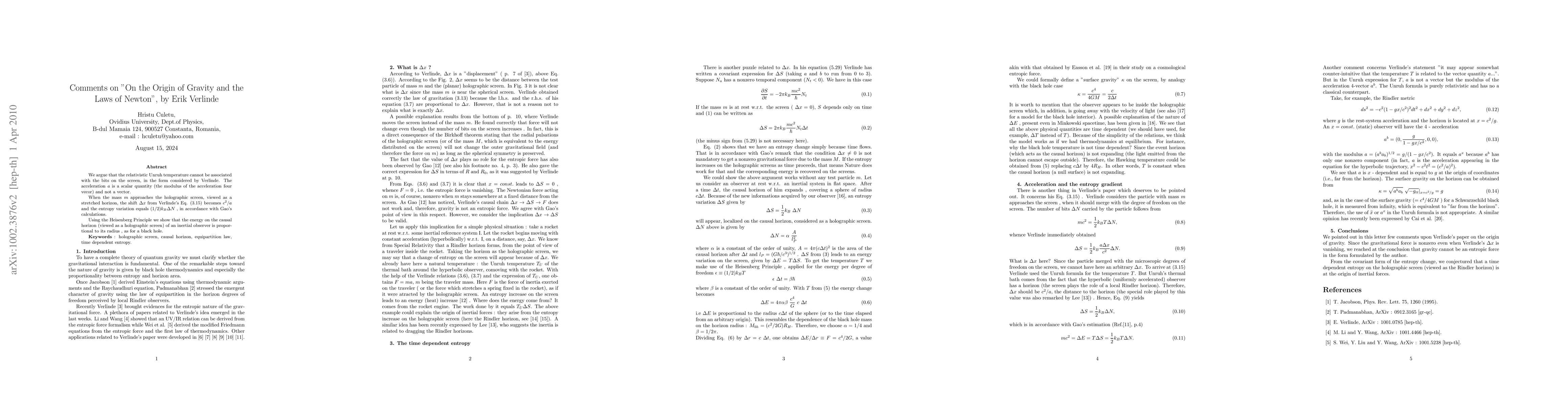 This paper critiques Verlinde's 'On the Origin of Gravity' by arguing against associating the relativistic Unruh temperature with bits on the screen. It shows that the acceleration 'a' is scalar, not vector, and recalculates entropy variation near a holographic screen. Using Heisenberg's Principle, it establishes that the energy on a causal horizon (viewed as holographic) of an inertial observer is proportional to its radius, like a black hole.