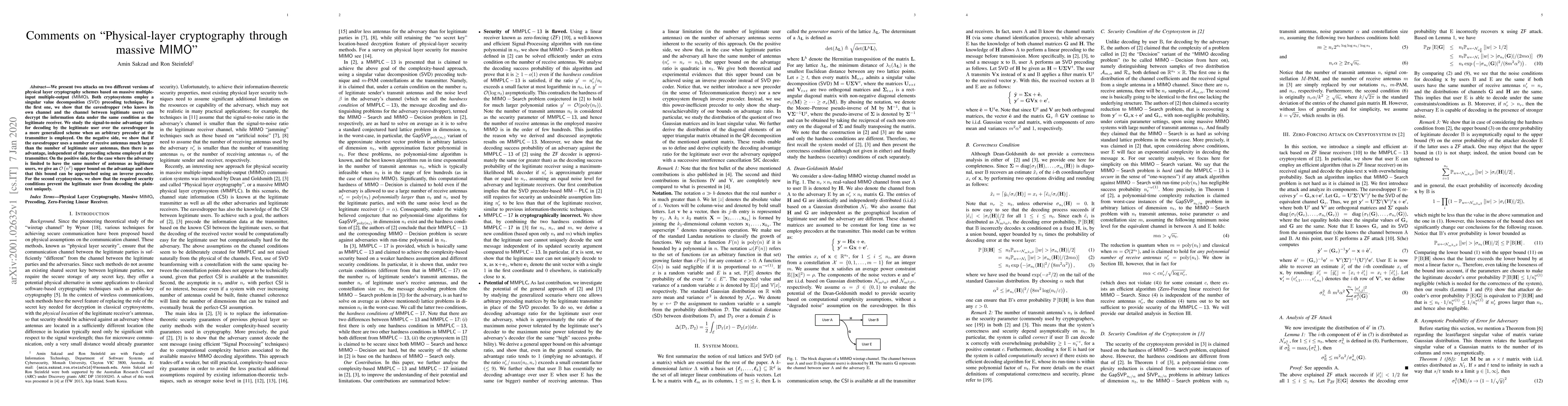 This paper presents attacks on two physical-layer cryptography schemes using massive MIMO and SVD precoding. It reveals vulnerabilities in the eavesdropper's ability to decrypt information and discusses the limitations and advantages of different precoding strategies.