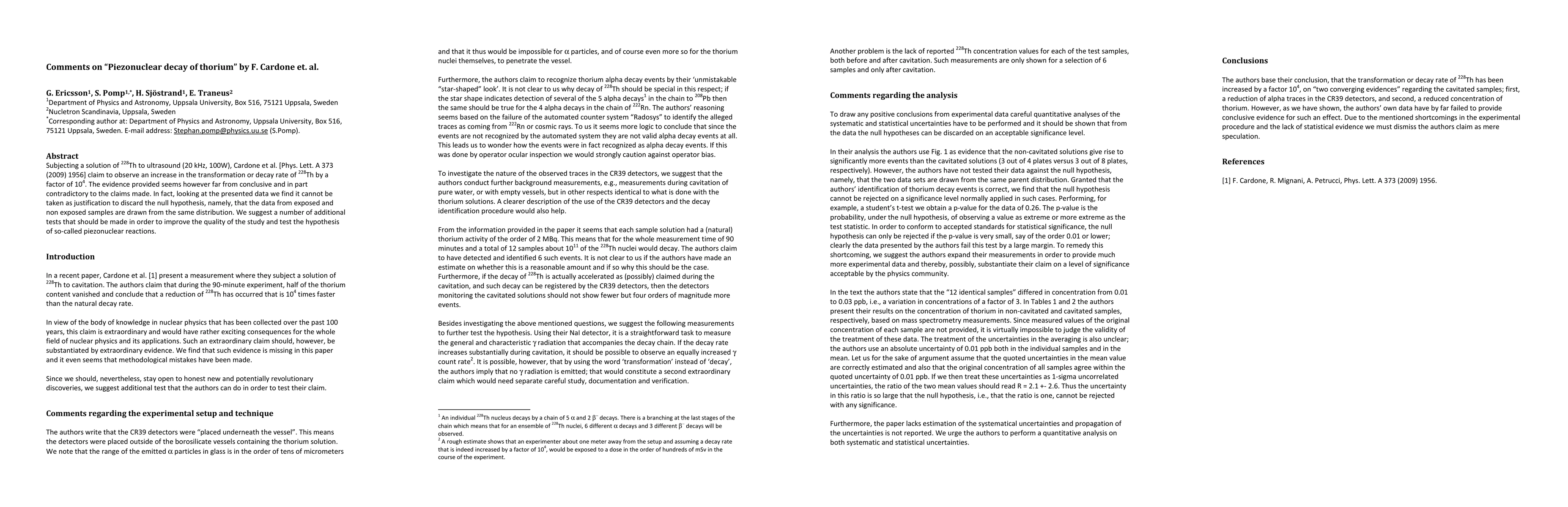 This paper critiques Cardone et al.'s claim of a tenfold increase in the decay rate of thorium-228 under ultrasound, arguing that the evidence is inconclusive and contradictory. The authors suggest additional tests to better evaluate the hypothesis of piezonuclear reactions.