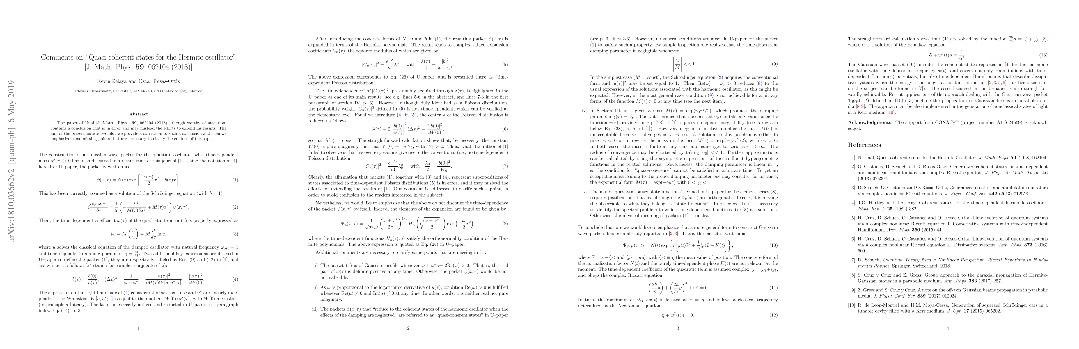 A paper corrects errors in Unal's 2018 work on quasi-coherent states for the Hermite oscillator, providing a correction to an incorrect conclusion and highlighting missing points.
