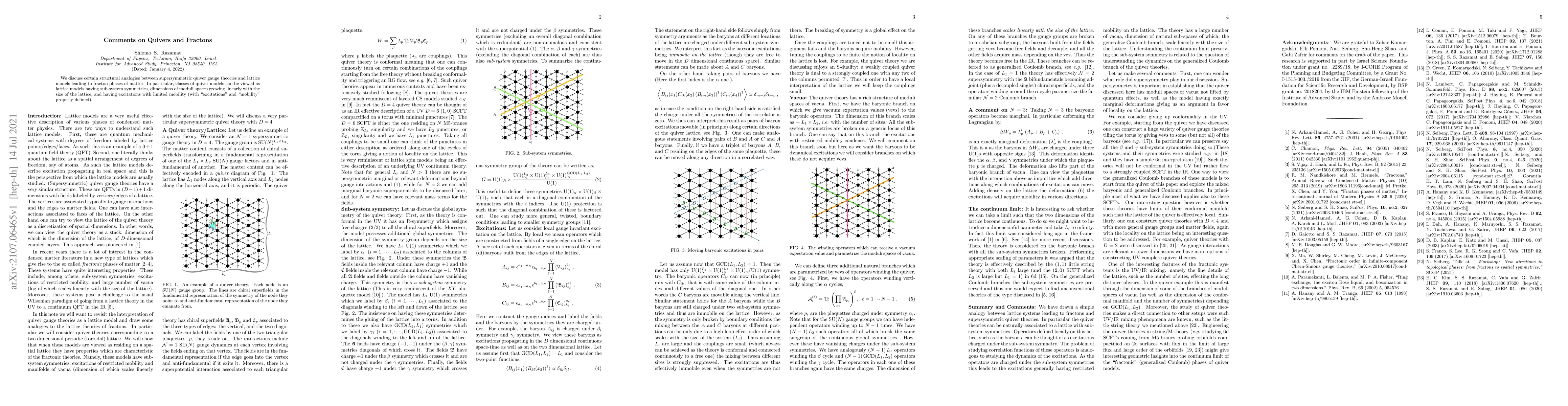 We discuss certain structural analogies between supersymmetric quiver gauge theories and lattice models leading to fracton phases of matter. In particular, classes of quiver models can be viewed as lattice models having sub-system symmetries, dimensions of moduli spaces growing linearly with the size of the lattice, and having excitations with limited mobility (with "excitations" and "mobility" properly defined).