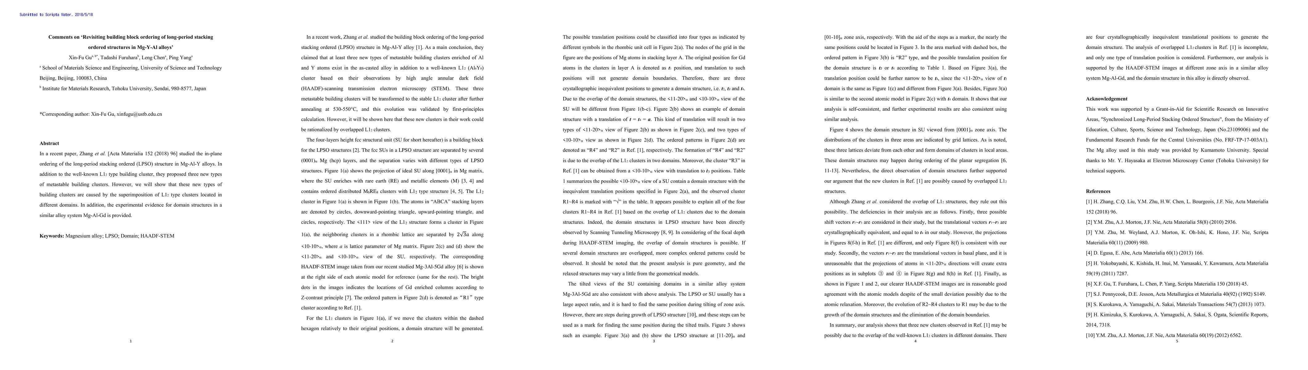 In a recent paper, Zhang et al. [Acta Materialia 152 (2018) 96] studied the in-plane ordering of the long-period stacking ordered (LPSO) structure in Mg-Al-Y alloys. In addition to the well-known L12 type building cluster, they proposed three new types of metastable building clusters. However, we will show that these new types of building clusters are caused by the superimposition of L12 type clusters located in different domains. In addition, the experimental evidence for domain structures in a similar alloy system Mg-Al-Gd is provided.
