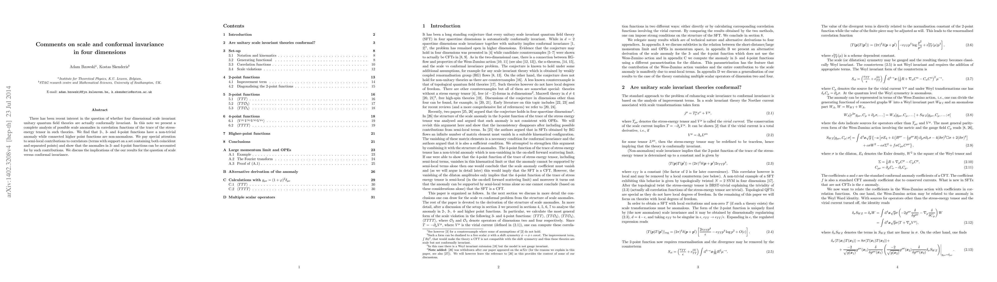 This paper analyzes the scale and conformal invariance in four-dimensional quantum field theories, finding non-trivial anomalies in 2-, 3-, and 4-point correlation functions of the trace of the stress-energy tensor. It shows that semi-local contributions can account for the anomalies in 3- and 4-point functions, thus discussing the implications for the distinction between scale and conformal invariance.