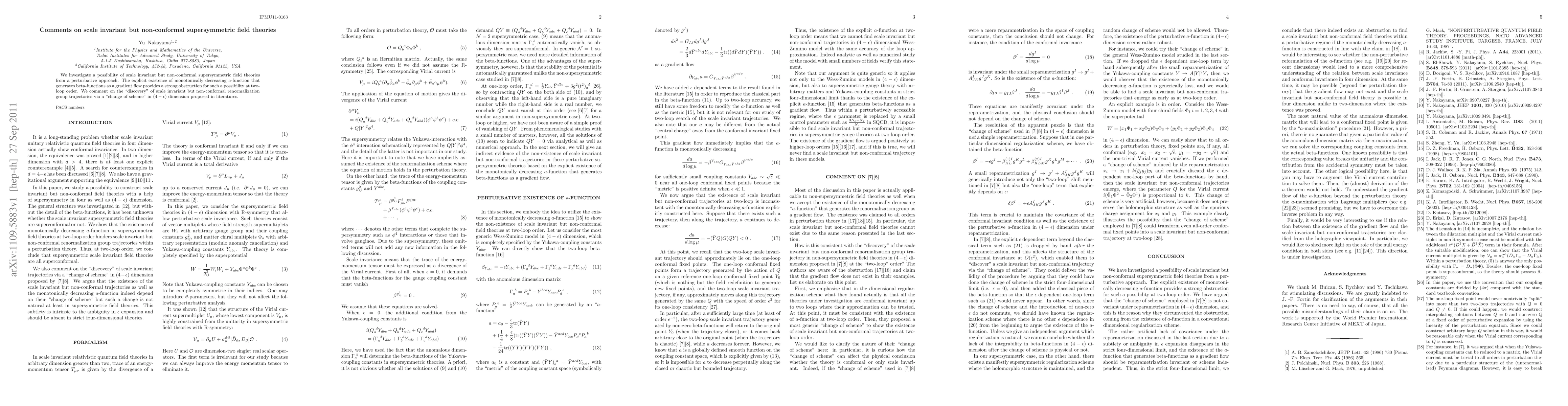 We investigate a possibility of scale invariant but non-conformal supersymmetric field theories from a perturbative approach. The explicit existence of monotonically decreasing a-function that generates beta-functions as a gradient flow provides a strong obstruction for such a possibility at two-loop order. We comment on the "discovery" of scale invariant but non-conformal renormalization group trajectories via a "change of scheme" in (4-\epsilon) dimension proposed in literatures.