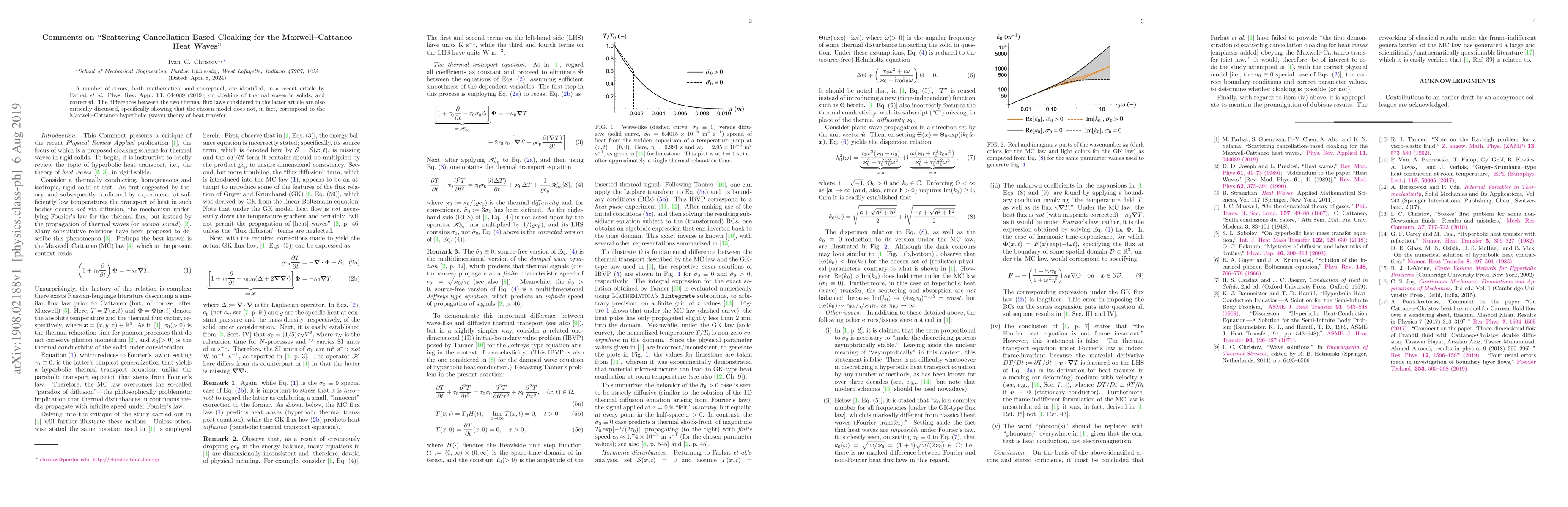 A number of errors, both mathematical and conceptual, are identified, in a recent article by Farhat \textit{et al.}\ [Phys.\ Rev.\ Appl.\ \textbf{11}, 044089 (2019)] on cloaking of thermal waves in solids, and corrected. The differences between the two thermal flux laws considered in the latter article are also critically discussed, specifically showing that the chosen model does not, in fact, correspond to the Maxwell--Cattaneo hyperbolic (wave) theory of heat transfer.