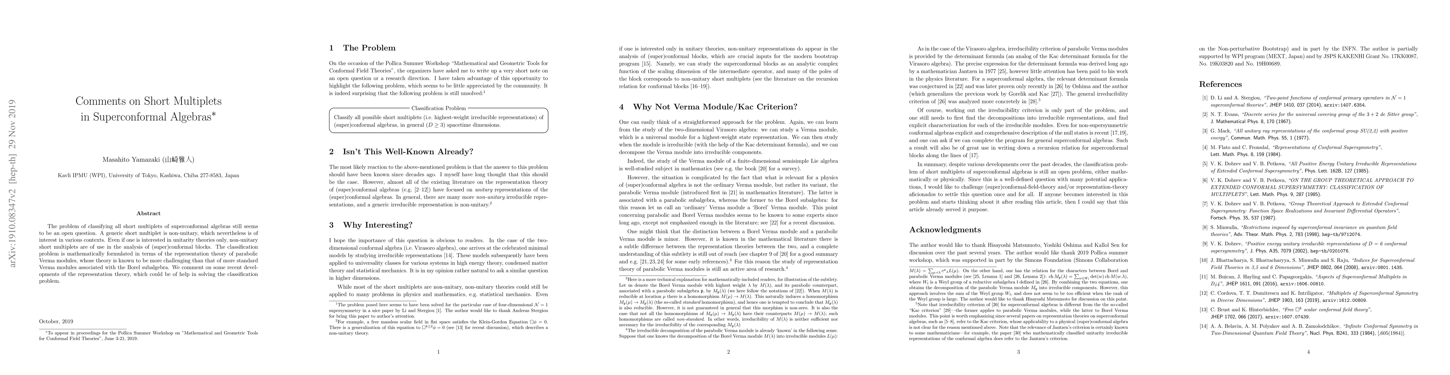 The problem of classifying all short multiplets of superconformal algebras still seems to be an open question. A generic short multiplet is non-unitary, which nevertheless is of interest in various contexts. Even if one is interested in unitarity theories only, non-unitary short multiplets are of use in the analysis of (super)conformal blocks. The classification problem is mathematically formulated in terms of the representation theory of parabolic Verma modules, whose theory is known to be more challenging than that of more standard Verma modules associated with the Borel subalgebra. We comment on some recent developments of the representation theory, which could be of help in solving the classification problem.