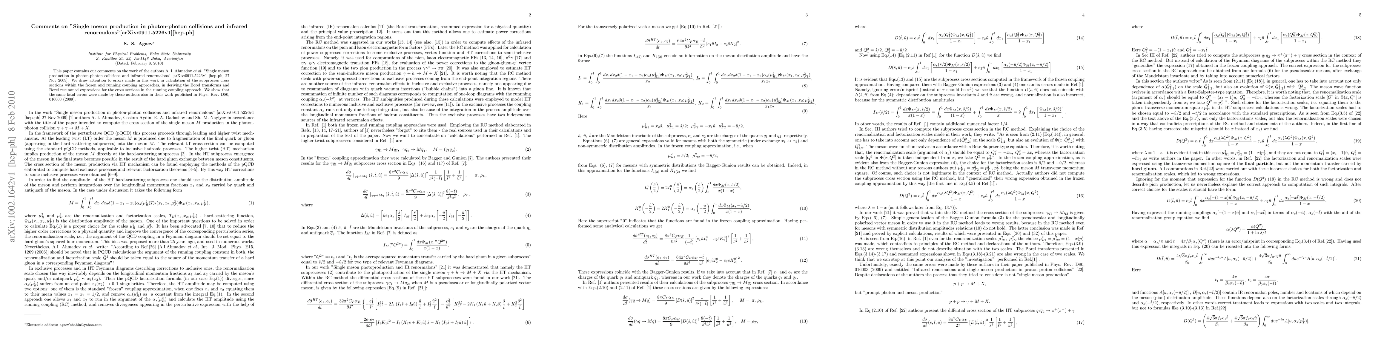 This paper contains our comments on the work of the authors A. I. Ahmadov \textit{et al.} "Single meson production in photon-photon collisions and infrared renormalons" [arXiv:0911.5226v1 27 Nov 2009]. We draw attention to errors made in this work in calculation of the subprocess cross sections within the frozen and running coupling approaches, in deriving the Borel transforms and Borel resummed expressions for the cross sections in the running coupling approach. We show that the same fatal errors were made by these authors also in their work published in Phys. Rev. D80, 016003 (2009).